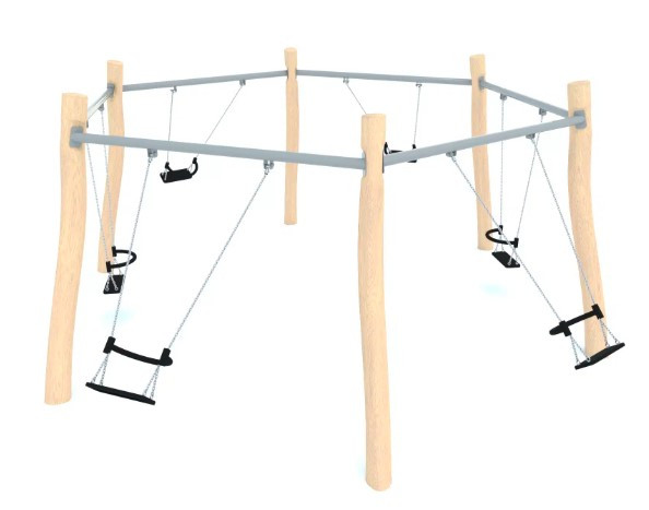 Robustní a odolná houpačka určená pro děti ve věku 1–12 let. Konstrukce kombinuje přírodní estetiku a vysokou odolnost: sloupy jsou vyrobeny z masivního akátového (Robinie) dřeva, které je přirozeně odolné vůči povětrnostním vlivům a chráněné proti rozštípnutí. Kovové prvky z černé oceli S235JR jsou pískované a ošetřené proti korozi pro dlouhou životnost.