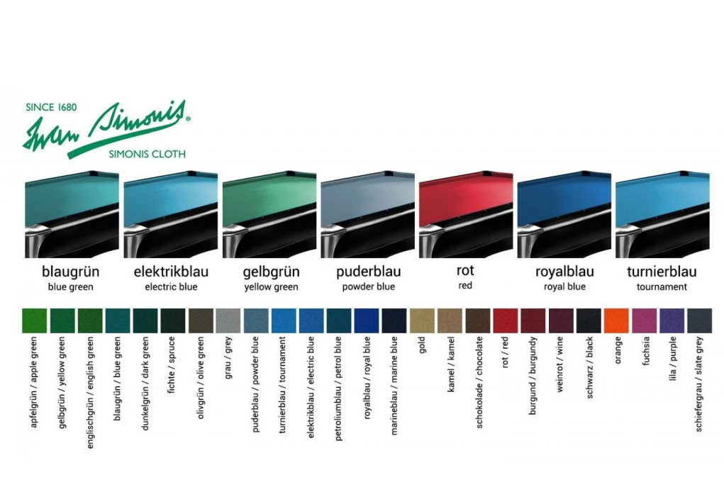 Základní sukno modré nebo zelené v ceně stolu (u karambolu Buffalo Royal Plus) nebo za příplatek Simonis (dle vzorníku), Z9.