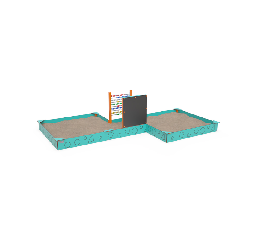 Bezúdržbové dvojité pískoviště má po svém obvodu lištu z HPL materiálu o tloušťce 10 mm, která zabraňuje přepadávání písku mimo pískoviště. Střední část s počítadlem a kreslicí tabulí nabízí dětem zábavu, prostor pro hru i možnost procvičit si počítání. Na počítadle si mohou děti hravou formou trénovat sčítání, odčítání nebo malou násobilku. V rozích pískoviště se nacházejí sedáky ve tvaru trojúhelníku, vhodné pro děti i rodiče. Konstrukce pískoviště a přístřešku je vyrobena z pozinkované a práškově lakované oceli, s důrazem na dlouhou životnost a maximální bezpečnost. Boční stěny, kreslicí tabule i sedáky jsou vyrobeny z HPL materiálu, který je chemicky i UV odolný, netoxický, recyklovatelný a nelámavý. Nehrozí tak poranění ostrými hranami či úlomky.