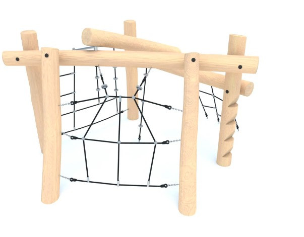 Tato víceúčelová dětská prolézačka je vyrobena z odolného dřeva a obsahuje lanové prvky pro lezení a šplhání. Konstrukce je navržena pro rozvoj pohybových schopností dětí a zábavu na čerstvém vzduchu. Vhodná je jak na veřejná hřiště, tak do školních či rekreačních areálů.