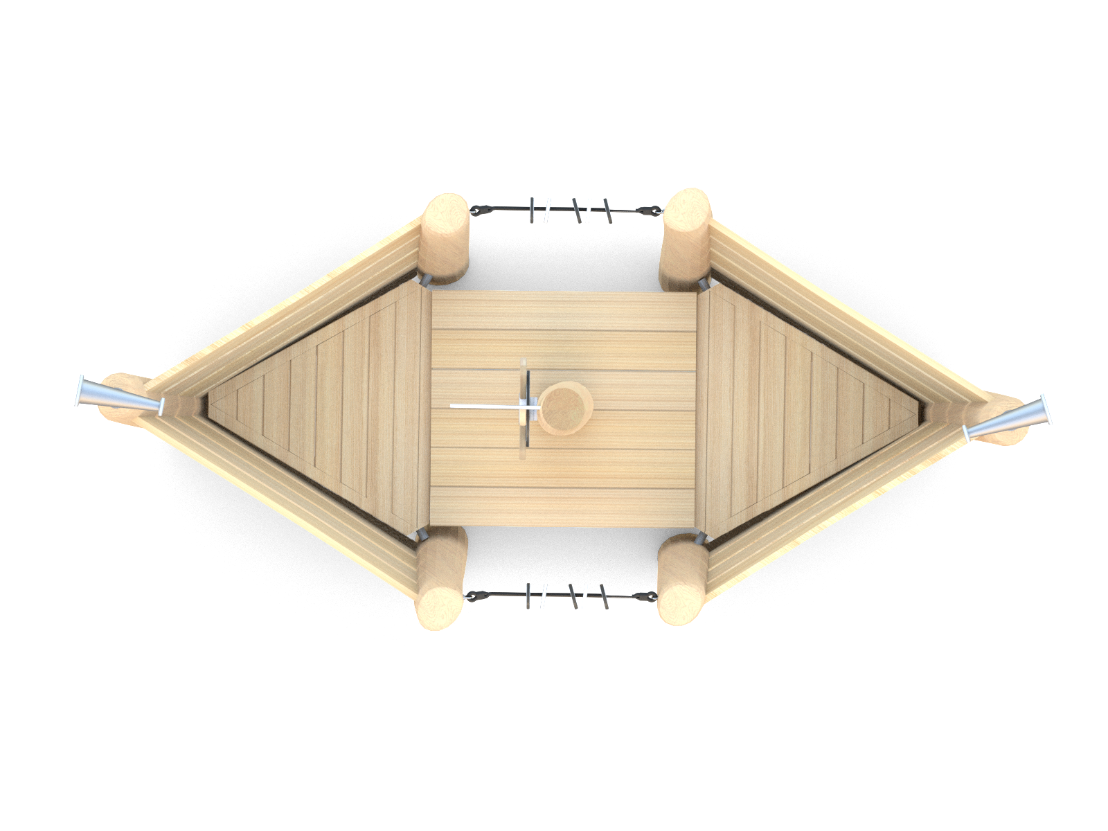 Konstrukce je z přírodního robiniového dřeva. Lana jsou z polypropylenového vlákna s ocelovým jádrem o průměru 16 mm. Boční výplně jsou z odolného 15mm HDPE polyetylenu.