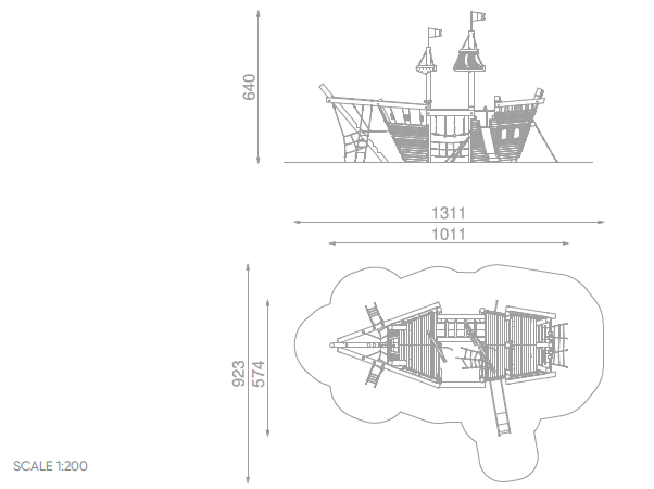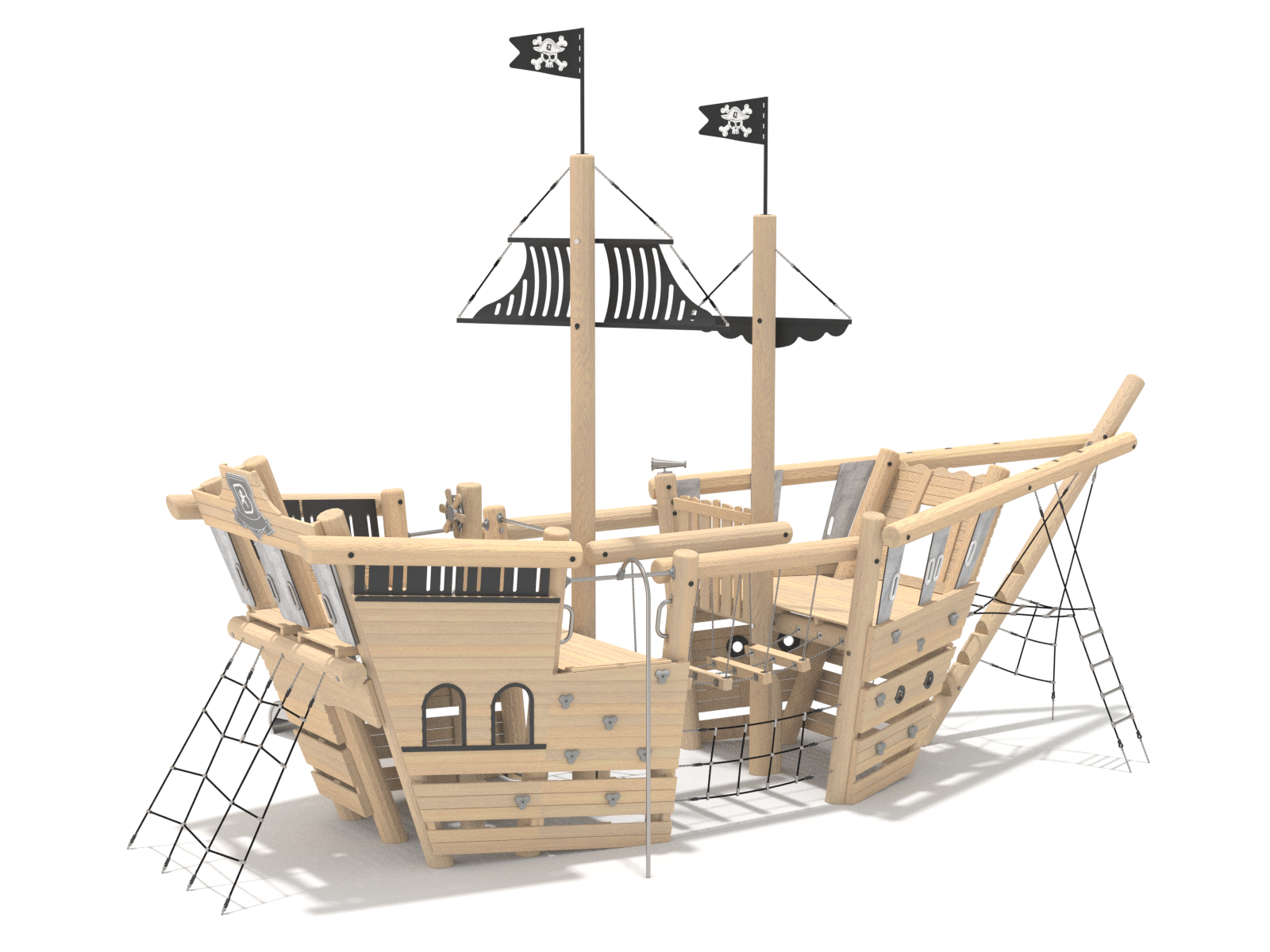 Rozsáhlá tematická herní loď vytváří výrazný a nepřehlédnutelný prvek každého hřiště. Kombinuje vyvýšené plošiny, lanové přechody, šplhací prvky i skluzavku, čímž nabízí široké možnosti aktivní hry. Děti mohou lézt, balancovat i klouzat se, což podporuje rozvoj síly, koordinace a týmové spolupráce. Otevřené uspořádání umožňuje pohyb z více stran a zapojení větší skupiny dětí současně. Sestava je vhodná jako centrální atrakce větších veřejných hřišť.