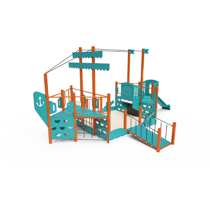 Tematická věžová sestava ve tvaru lodě je ideálním prvkem pro rozvoj dětské fantazie a skupinové hry. Děti na sestavu vylezou po kolmých lezeckých nebo lanových stěnách a sjíždějí dolů po skluzavce. Uprostřed sestavy je pískoviště o rozměru 3 × 3 m, které je snadno přístupné díky plošinám na obou stranách pískoviště. Sestavu doplňují ráhna s plachtami a vlajkami, kapitánský můstek s kormidlem, tabule na kreslení a příď s kotvou.