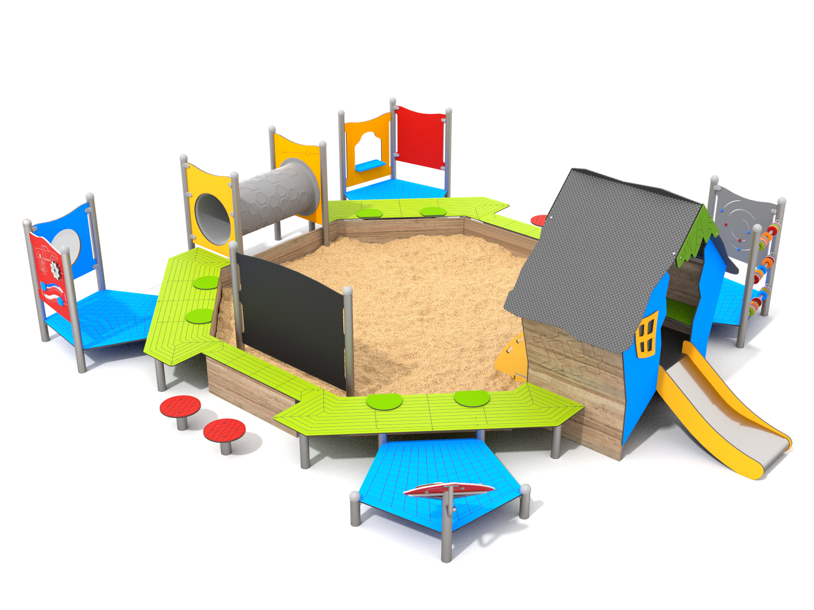 Interaktivní pískoviště s domečkem vytváří uzavřený herní prostor, který děti přirozeně vybízí k tvořivé i pohybové aktivitě. Dominantou je vyvýšený domeček s okénkem, ke kterému vedou schůdky a skluzavka pro plynulý pohyb nahoru i dolů. Po obvodu pískoviště jsou umístěny herní panely s různými prvky – například otočné prvky, tematické motivy nebo prolézací části, které rozvíjejí jemnou motoriku i fantazii.