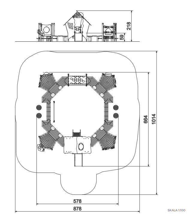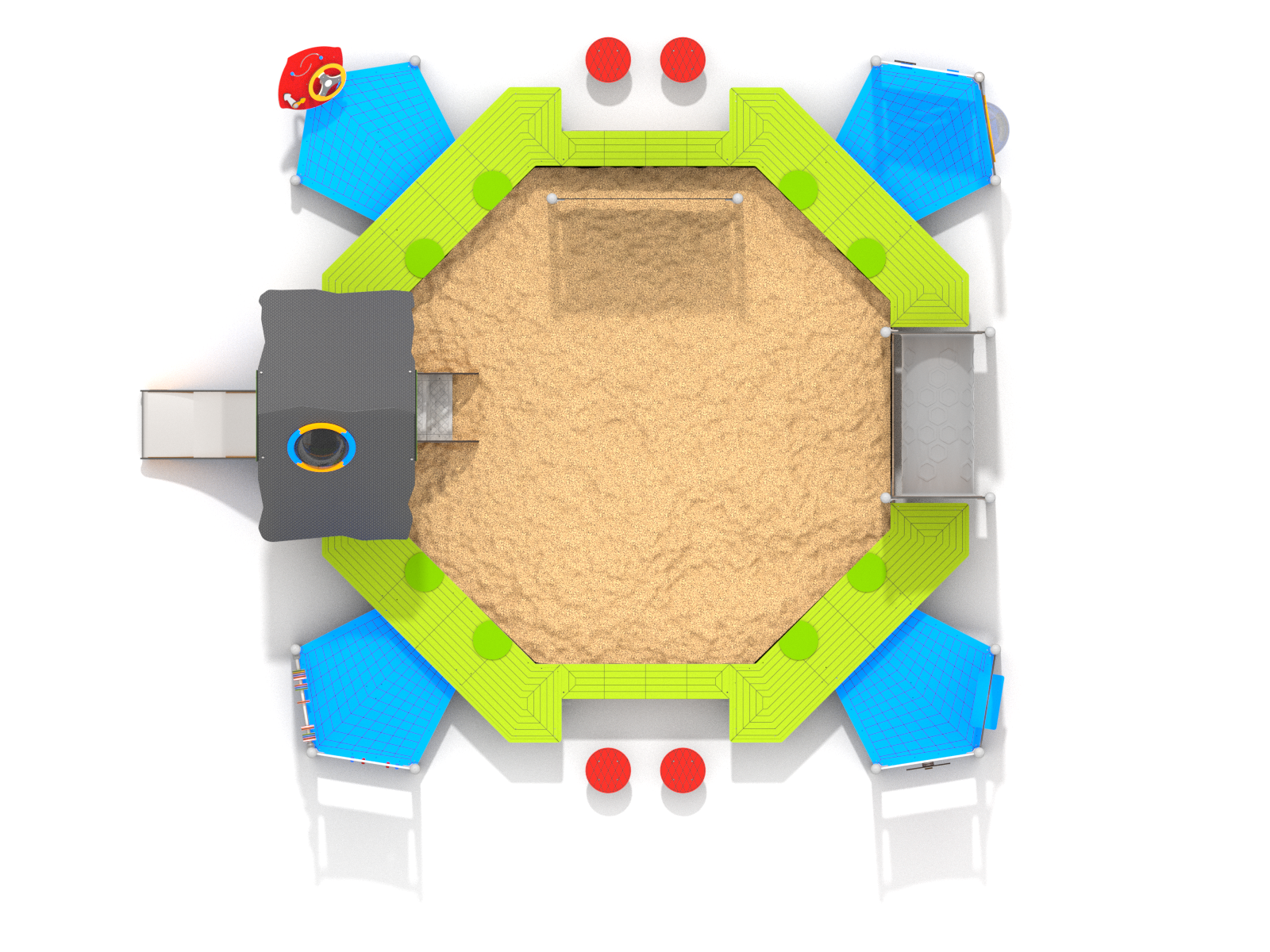 Součástí je také tunel pro prolézání, který podporuje koordinaci a orientaci v prostoru, a nízké plošiny vhodné k sezení, balancování nebo hře ve skupině. Celý prvek je navržen tak, aby umožňoval více dětem hrát si současně.