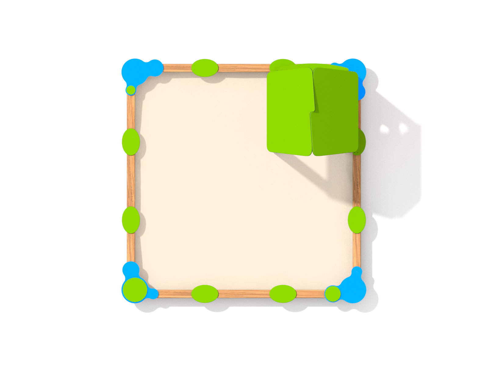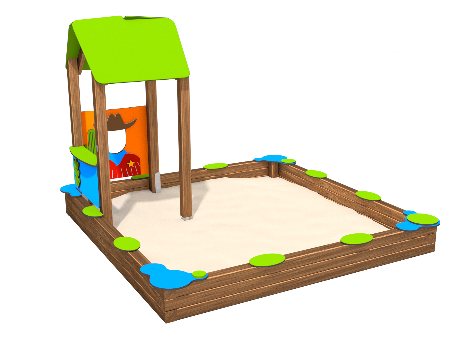 Konstrukce je tvořena z kvalitního, tlakově impregnovaného dřeva s jemně broušeným povrchem. Stříška domečku a boční panely jsou z barevného HDPE plastu, odolného proti UV záření, praskání i vyblednutí. Pískoviště má nízký rám a otevřený přístup ze všech stran.