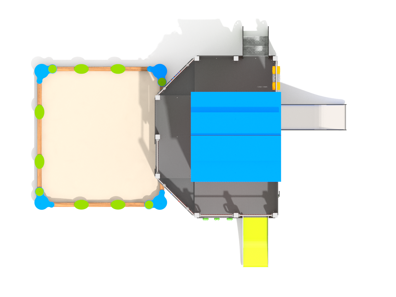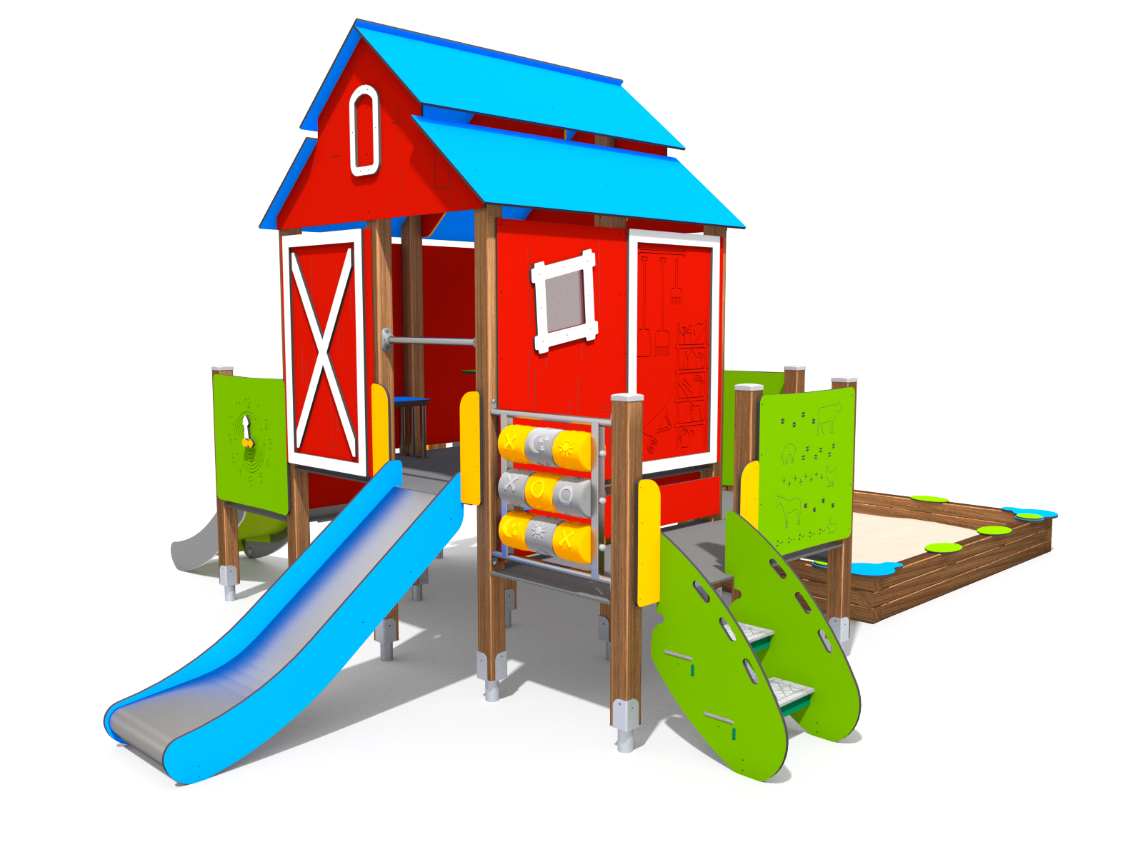 Tato sestava v sobě spojuje jednoduchost, bezpečnost a hravost v kompaktním provedení. Hlavním prvkem je vyvýšený herní domeček se sedlovou stříškou a interaktivními hracími prvky po stranách. Ty zahrnují otočné prvky a hrací tabuli, které podporují jemnou motoriku, soustředění i představivost dětí. Pod konstrukcí se nachází rozsáhlé pískoviště, ideální pro tvořivou hru ve stínu domečku.
