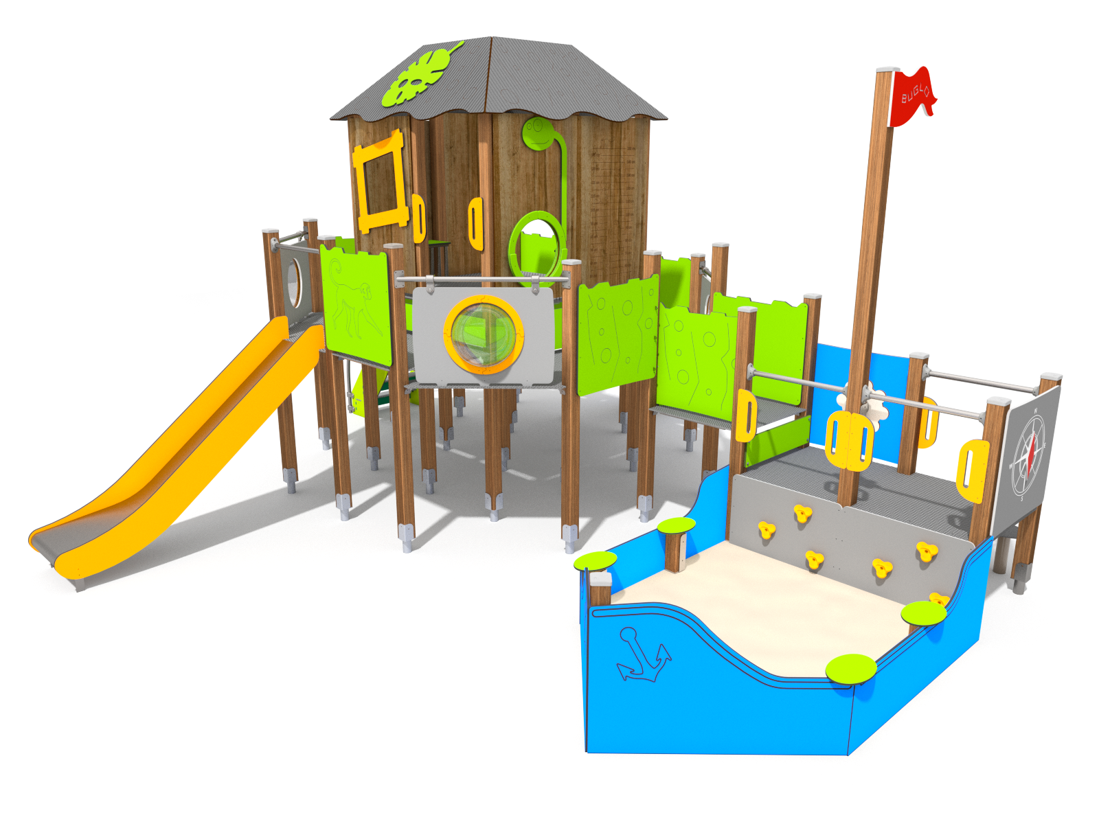 Tato nápaditá sestava připomíná tvarem palubu lodi s výraznou přídí, což z ní dělá skvělé zázemí pro dobrodružné hry na piráty, kapitány či mořeplavce. Dominantou je jedna věž s tmavší sedlovou stříškou, ke které se děti dostanou buď po šikmé nástupní rampě, nebo po klasických dřevěných schůdcích. Z plošiny vede skluzavka, která umožňuje rychlý návrat „na břeh“. Pískoviště se nachází v přídi lodi. Sestava je ideální pro symbolickou hru i klidné hraní s pískem.