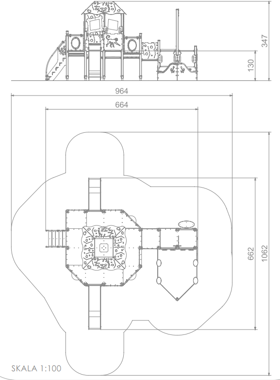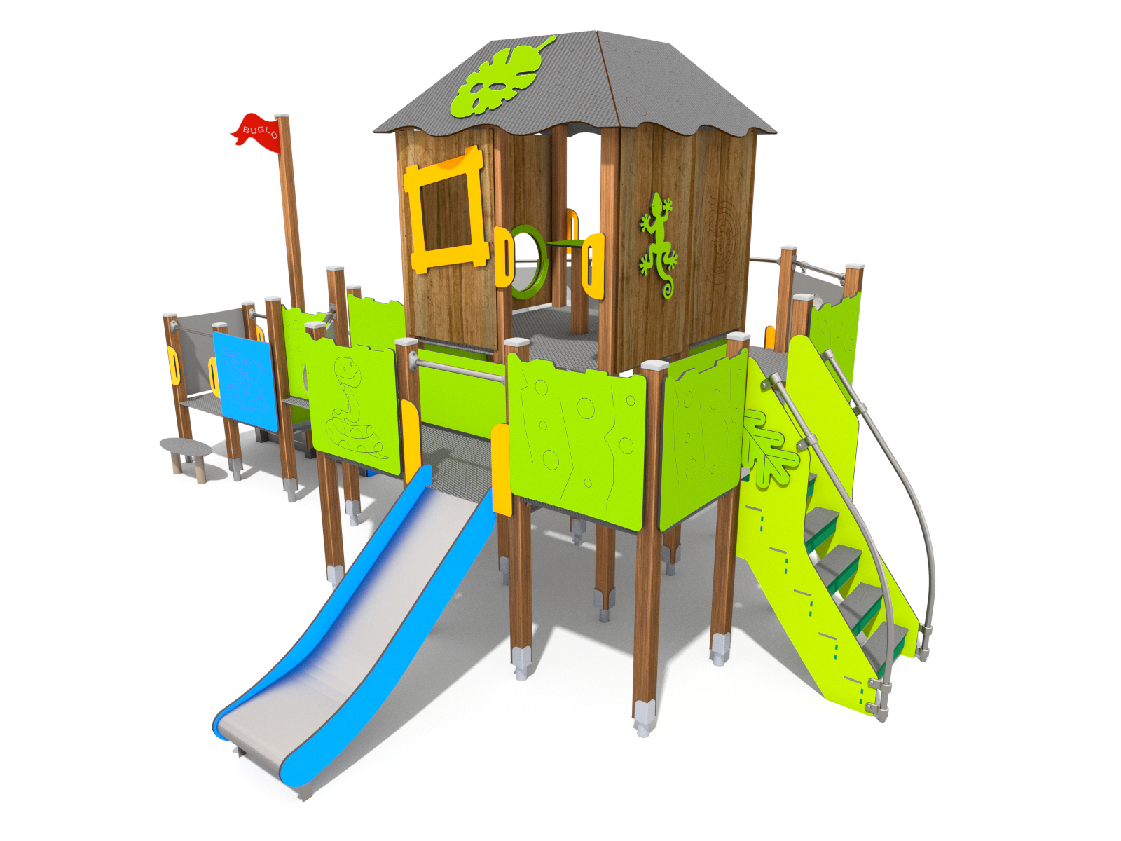Konstrukce je z pevného, tlakově impregnovaného dřeva s hladkým povrchem a zaoblenými hranami. Stříška, boční výplně rampy i skluzavka jsou vyrobeny z barevného HDPE plastu, který je UV stabilní a odolný vůči mechanickému opotřebení. Pískoviště má pevný dřevěný lem a je snadno přístupné ze všech stran.