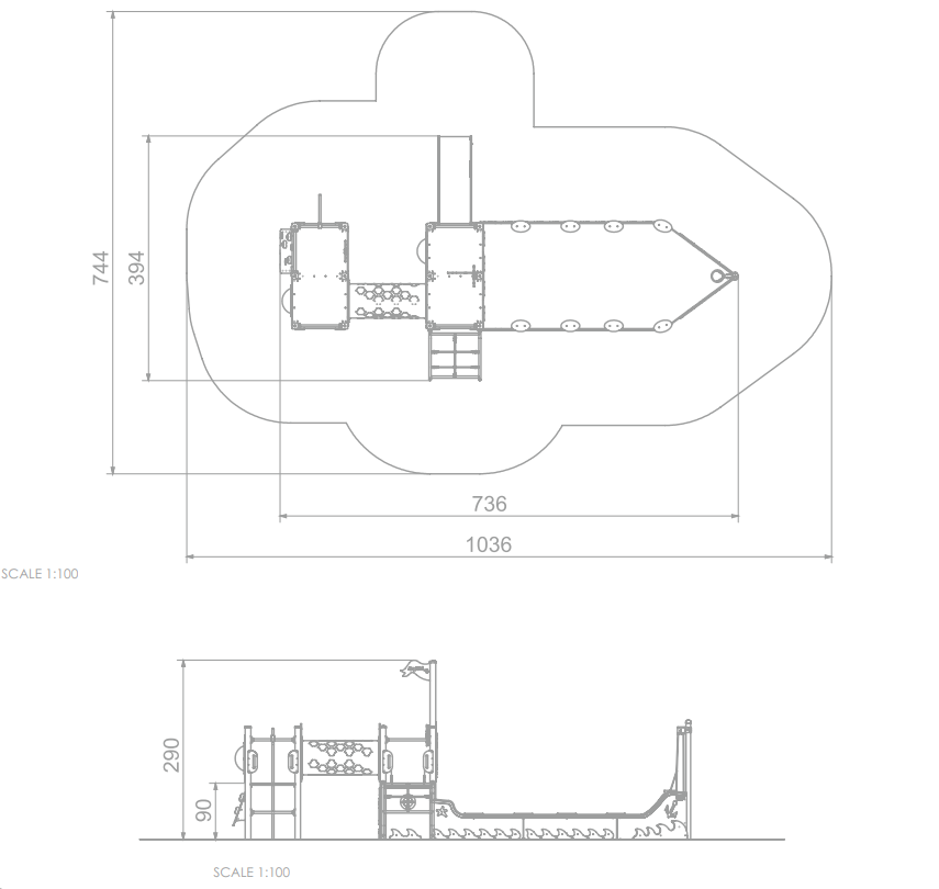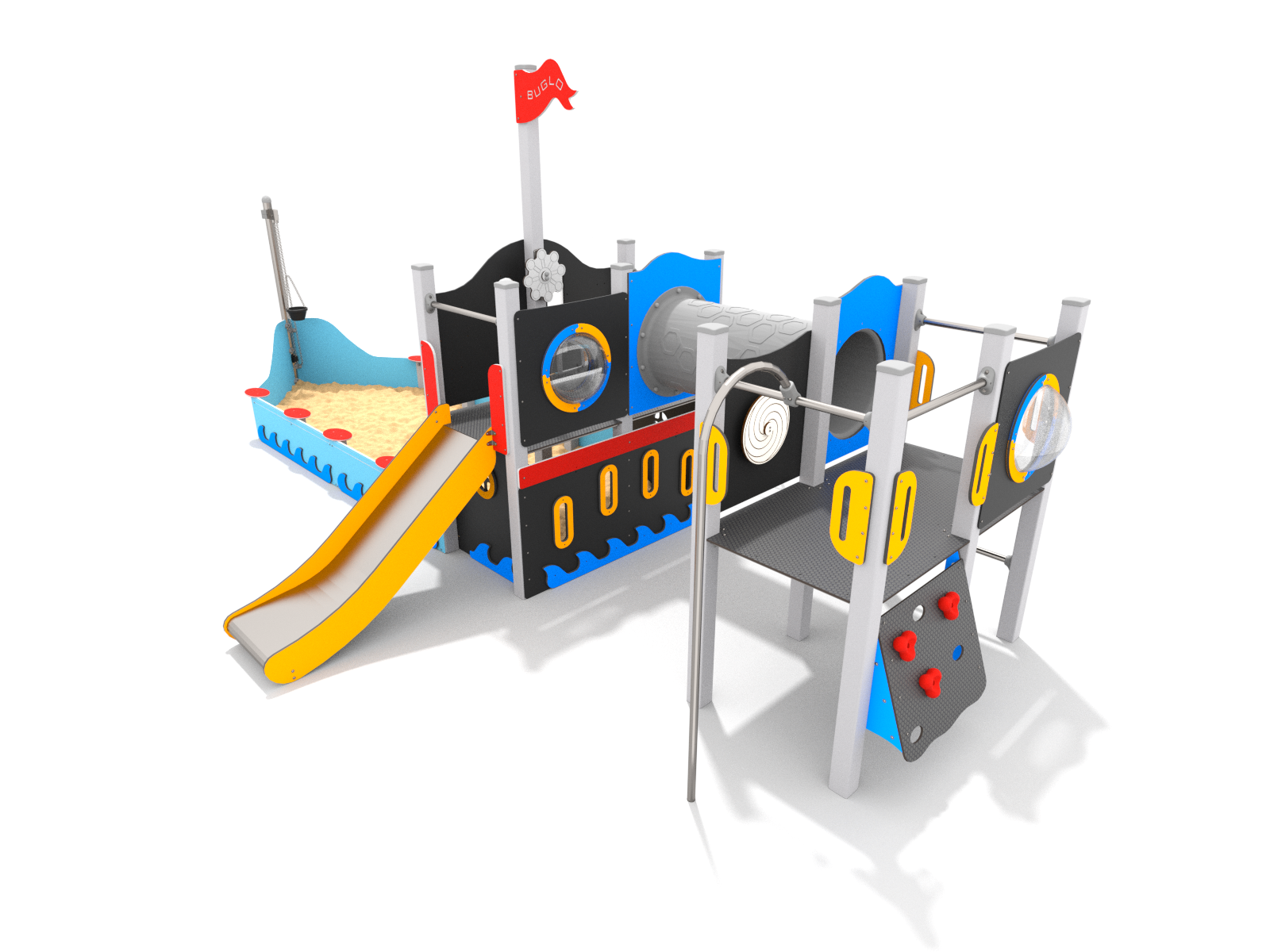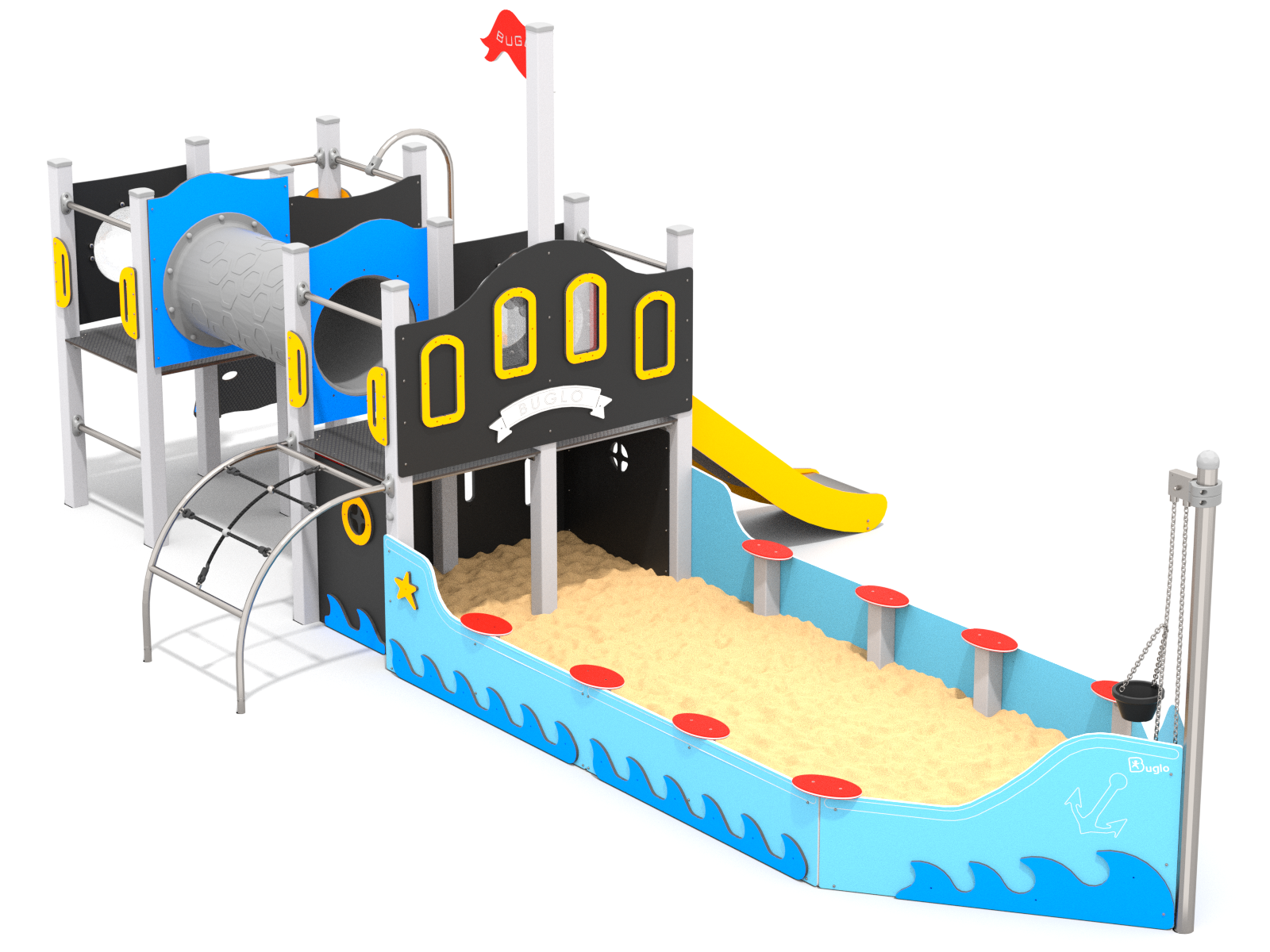 Tato herní sestava v sobě skrývá překvapivě hodně herních možností. Její dominantou je nízká otevřená věž, ze které vede plastová skluzavka. Vstup do věže je umožněn nástupní rampou s bočními panely, které usnadňují výstup a zároveň fungují jako zábrana. Nejzajímavějším prvkem je však pískoviště umístěné pod věží, které má díky svému tvaru výraznou špičku připomínající příď lodi – ideální pro tematické hry na piráty, kapitány nebo průzkumníky.