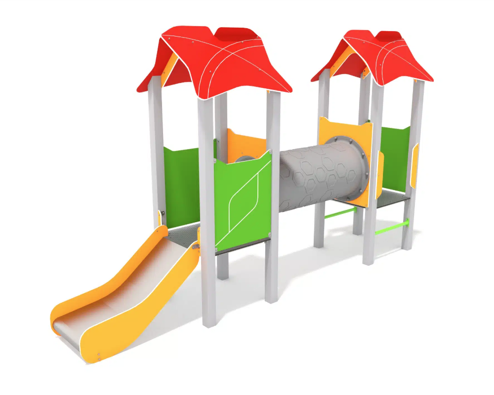 Herní sestava kombinuje více herních prvků do jednoho celku – nabízí lezecké části, skluzavky, tunel a další prvky podporující koordinaci a fyzickou aktivitu dětí. Vhodná pro školky, školy i veřejná hřiště.