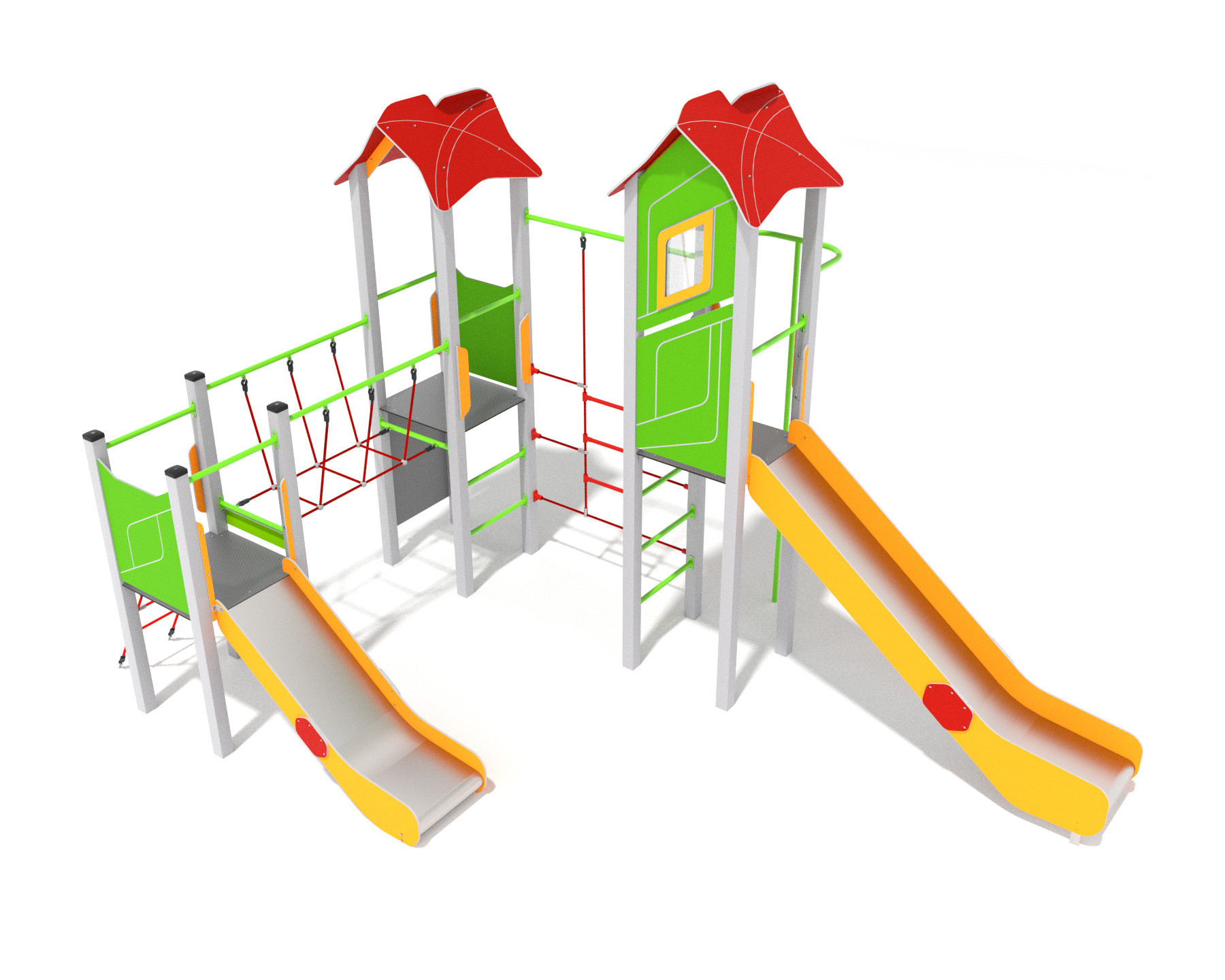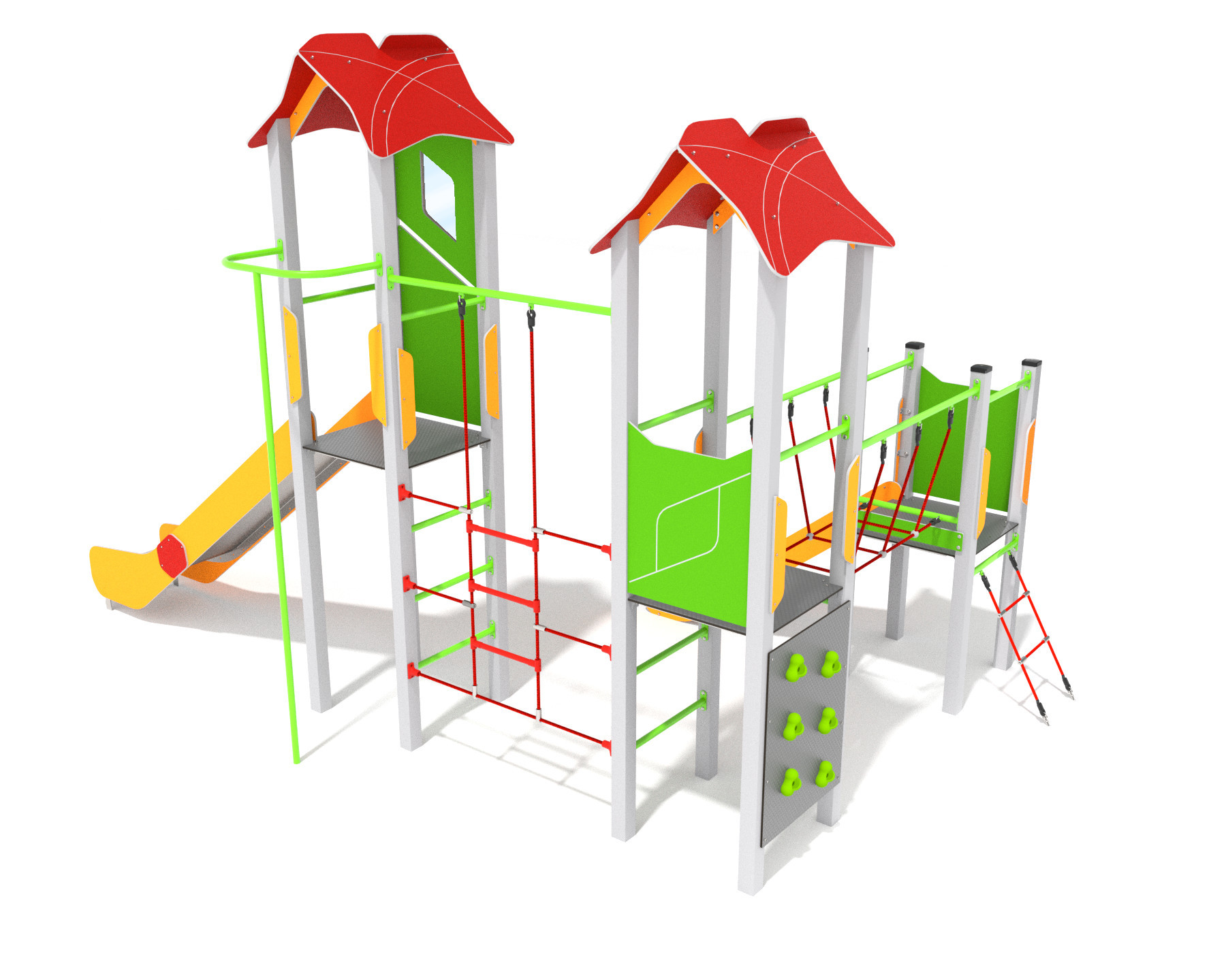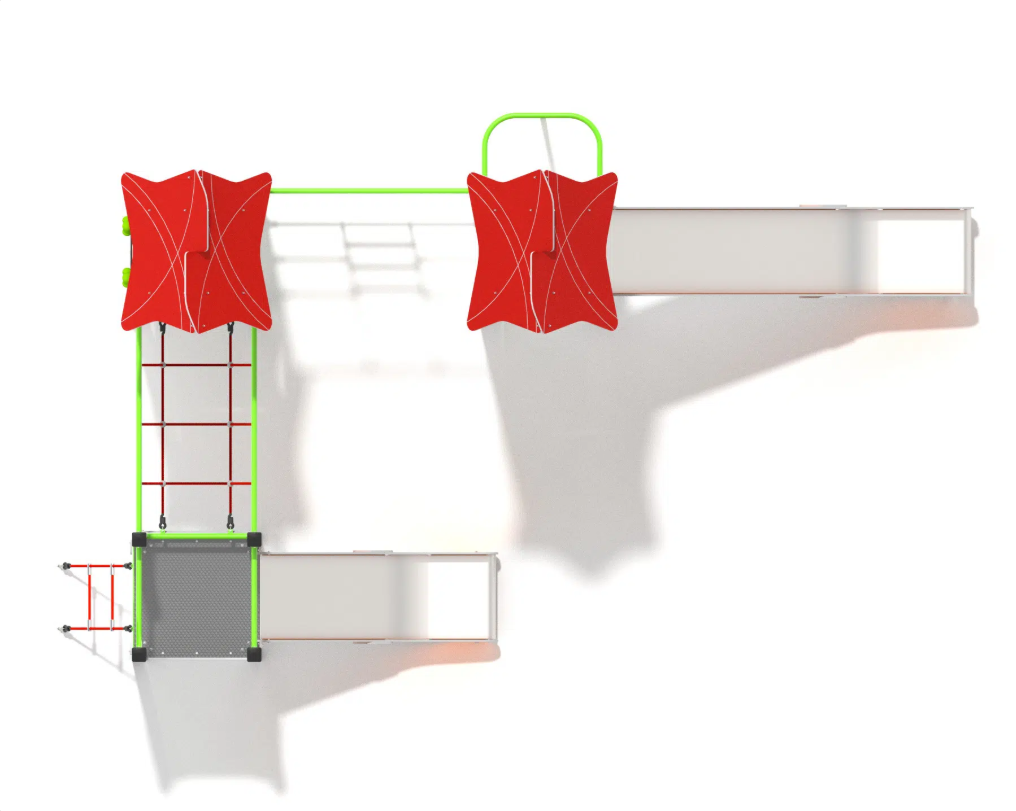 Moderní herní sestava se dvěma věžemi přináší dětem spoustu pohybu i zábavy na jednom místě. Díky propojeným prvkům podporuje lezení, rovnováhu i koordinaci a je ideální pro veřejná hřiště i školní zahrady. Výrazné barevné provedení zaujme na první pohled a zároveň zvyšuje bezpečnost díky dobré viditelnosti. Konstrukce je navržena pro dlouhodobé venkovní použití s minimálními nároky na údržbu.