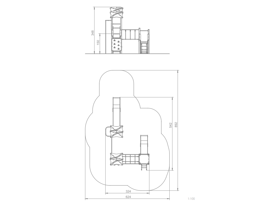Skluzavky jsou vyrobeny z nerezové oceli v kombinaci s odolnými HDPE panely, které zvládají UV záření i vlhkost. Nosná konstrukce je z pevné oceli s povrchovou úpravou proti korozi, doplněná o protiskluzové HPL desky na pochozích plochách. Lanové prvky mají ocelové jádro pro maximální pevnost a dlouhou životnost.