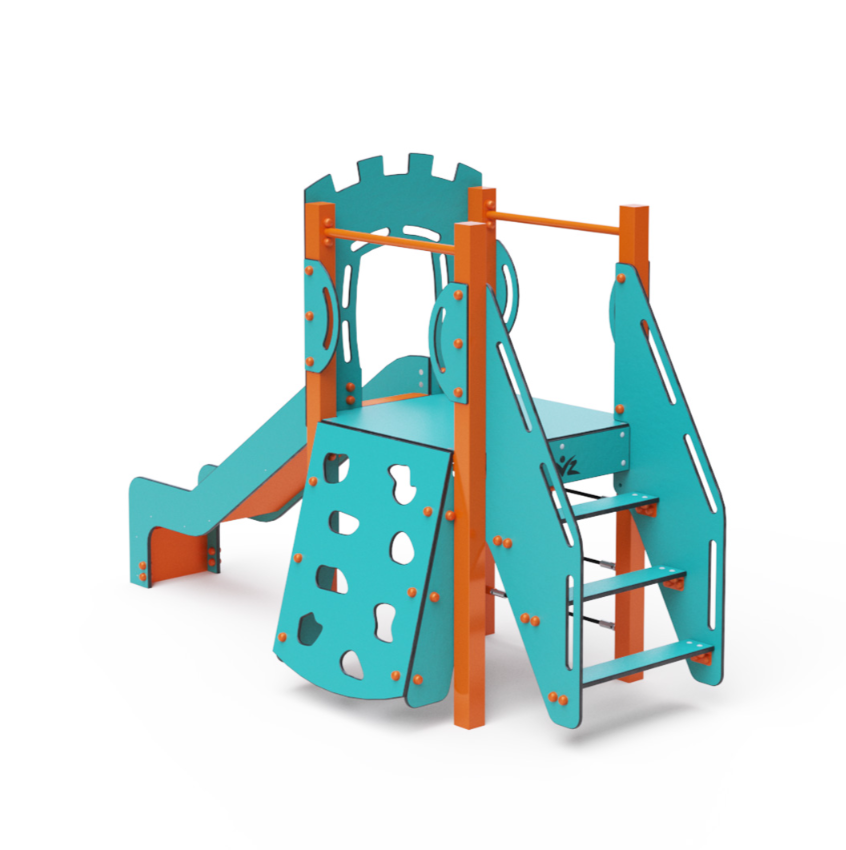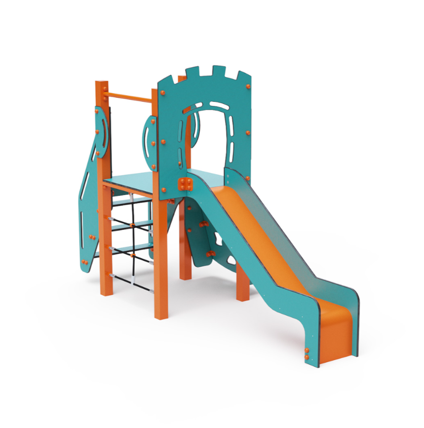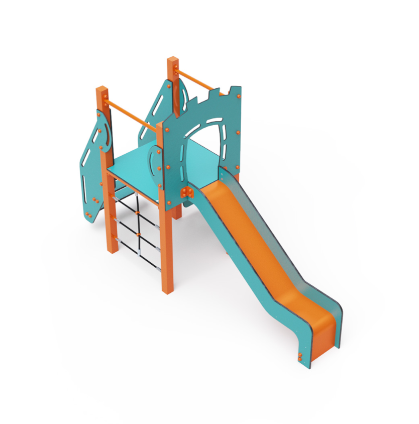 Jednověžová kombinovaná sestava – věž, na kterou děti vylezou po schůdcích, po lezecké stěně s úchyty nebo po lanové síti a dolů se mohou spustit po skluzavce. Výrazný design již z dálky láká ke hře. Ocelová konstrukce je odolná vůči povětrnostním vlivům díky žárovému zinkování a lakování odolnou práškovou barvou. Použitý HPL materiál je chemicky odolný, odolný vůči UV záření – stálobarevný, netoxický, recyklovatelný a nelámavý. Nehrozí tak poranění dětí ostrými hranami nebo úlomky. Lana jsou vyrobena z polyesterových vláken, která jsou vinuta kolem středové výztuže. Tato konstrukce lana zvyšuje jeho pevnost a odolnost proti mechanickému namáhání. Samotný polyester je odolný vůči mikroorganismům, povětrnostním vlivům, rychle schne po dešti, je stálobarevný a vyznačuje se vysokou pevností.