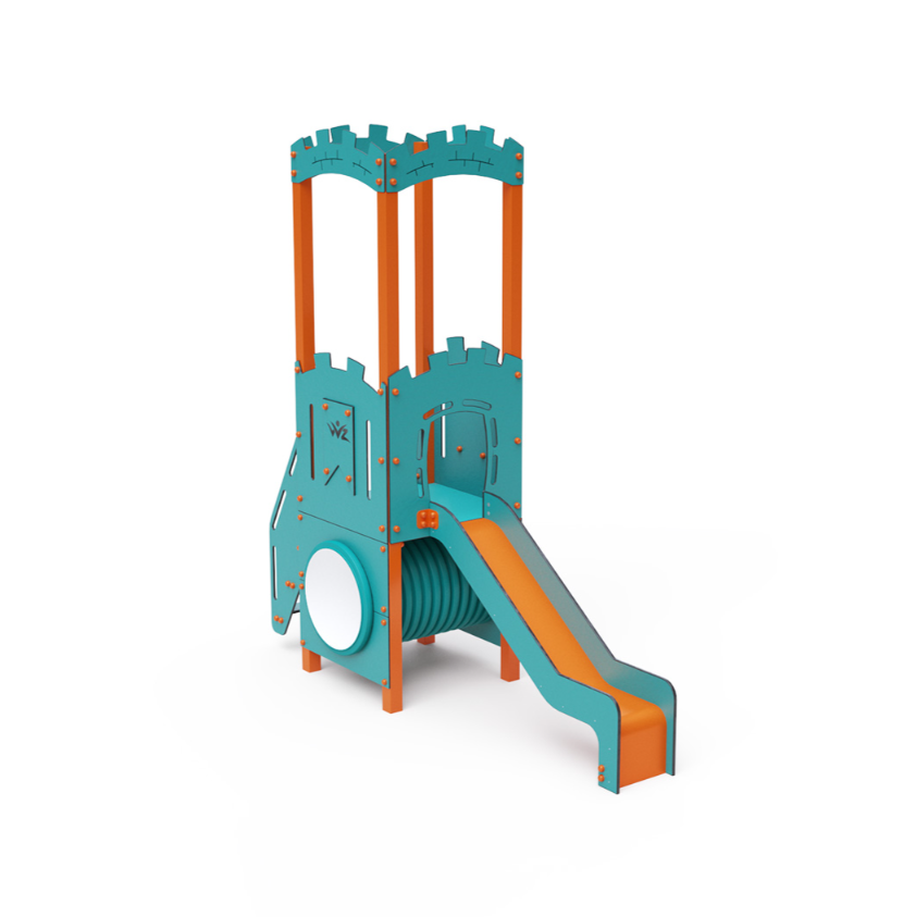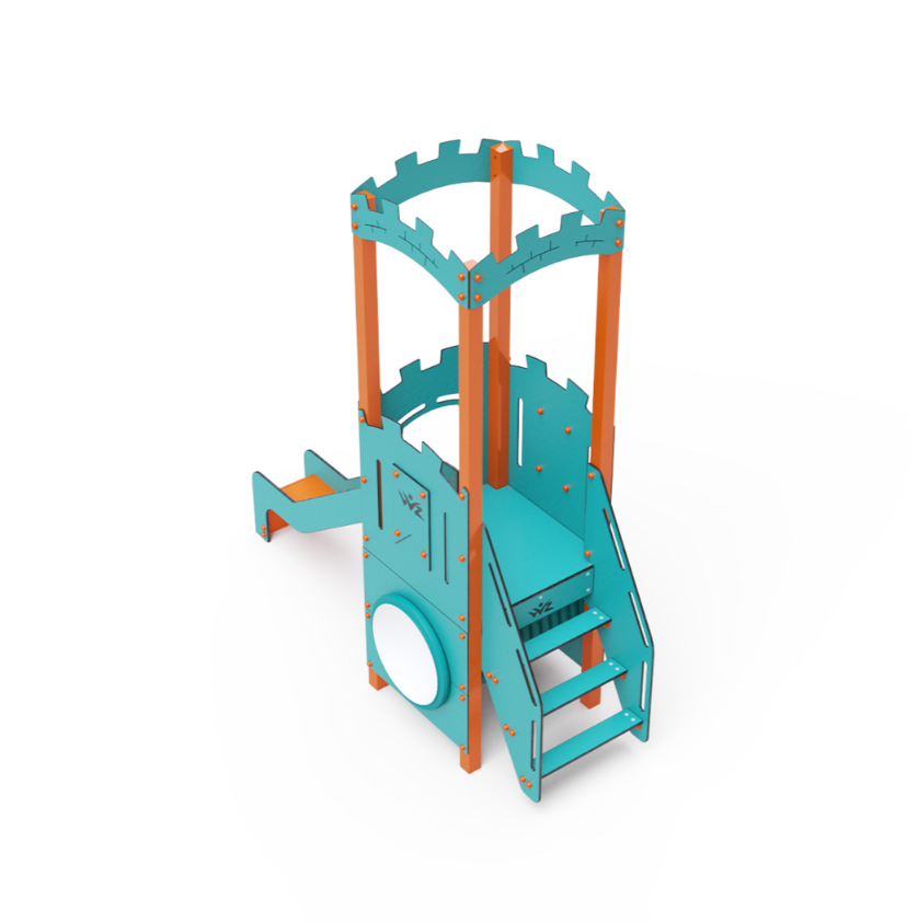 Jednověžová kombinovaná sestava – věž s hradbami, na kterou děti vylezou po schůdcích a dolů se mohou spustit po skluzavce. Zahrát si mohou také v tunelu, který je umístěn pod věží. Tyrkysově-oranžový design už z dálky láká ke hře. Ocelová konstrukce je odolná vůči povětrnostním vlivům díky žárovému zinkování a lakování odolnou práškovou barvou. Použitý HPL materiál je chemicky odolný, odolný vůči UV záření – stálobarevný, netoxický, recyklovatelný a nelámavý. Nehrozí tak poranění dětí ostrými hranami nebo úlomky. Všechny spoje jsou nerezové a zakryté plastovými krytkami pro zvýšení životnosti a bezpečnosti.