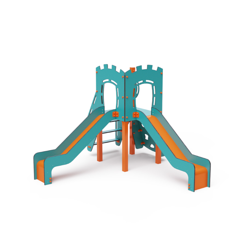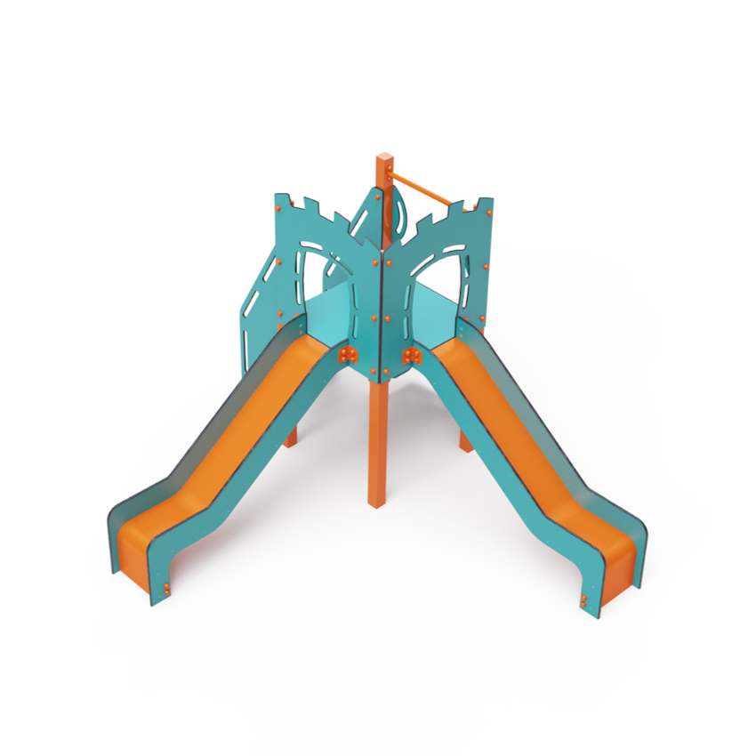Jednověžová kombinovaná sestava – věž, na kterou děti vylezou po schůdcích nebo po lezecké stěně s úchyty a dolů se mohou spustit po jedné ze dvou skluzavek. Tyrkysově-oranžový design už z dálky láká ke hře. Ocelová konstrukce je odolná vůči povětrnostním vlivům díky žárovému zinkování a lakování odolnou práškovou barvou. Použitý HPL materiál je chemicky odolný, odolný vůči UV záření – stálobarevný, netoxický, recyklovatelný a nelámavý. Nehrozí tak poranění dětí ostrými hranami nebo úlomky. Všechny spoje jsou nerezové a zakryté plastovými krytkami pro zvýšení životnosti a bezpečnosti.