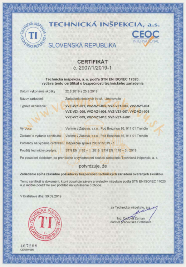 Kombinovaná věžová sestava a VVZ-VZ1-009 je certifikována dle ČSN EN 1176