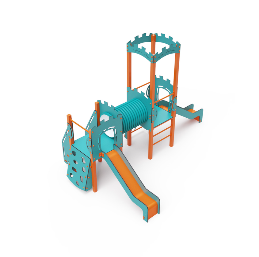 Dvouvěžová kombinovaná sestava – dvě věže propojené tunelem. Na sestavu děti vylezou po lezecké stěně s úchyty, po žebříku, po schůdcích nebo obloukové lanové síti a dolů se mohou spustit po jedné ze dvou skluzavek. Tyrkysově-oranžový design už z dálky láká ke hře. Ocelová konstrukce je odolná vůči povětrnostním vlivům díky žárovému zinkování a lakování odolnou práškovou barvou. Použitý HPL materiál je chemicky odolný, odolný vůči UV záření – stálobarevný, netoxický, recyklovatelný a nelámavý. Nehrozí tak poranění dětí ostrými hranami nebo úlomky. Lana jsou vyrobena z polyesterových vláken, která jsou vinutá kolem středové výztuže. Tato konstrukce lana zvyšuje jeho pevnost a odolnost proti mechanickému namáhání.