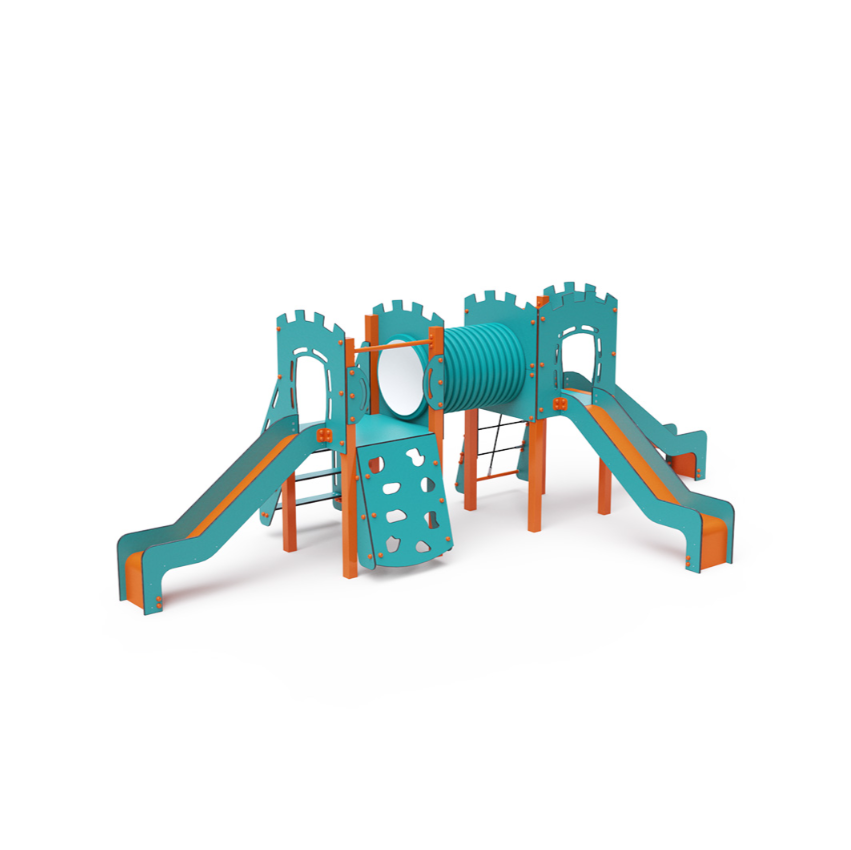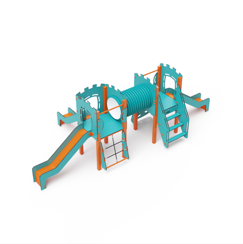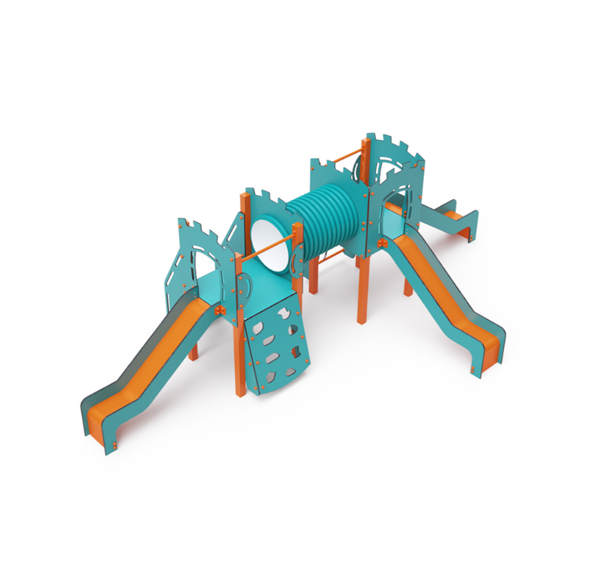 Dvouvěžová kombinovaná sestava – dvě věže propojené tunelem. Na sestavu děti vylezou po schůdcích, po lezecké stěně s úchyty nebo po obloukové lanové síti a dolů se mohou spustit po jedné ze tří skluzavek. Tyrkysově-oranžový design už z dálky láká ke hře. Ocelová konstrukce je odolná vůči povětrnostním vlivům díky žárovému zinkování a lakování odolnou práškovou barvou. Použitý HPL plast je chemicky odolný, odolný vůči UV záření – stálobarevný, netoxický, recyklovatelný a nelámavý. Nehrozí tak poranění dětí ostrými hranami nebo úlomky. Lana jsou vyrobena z polyesterových vláken, která jsou vinutá kolem středové výztuže. Tato konstrukce lana zvyšuje jeho pevnost a odolnost proti mechanickému namáhání.
