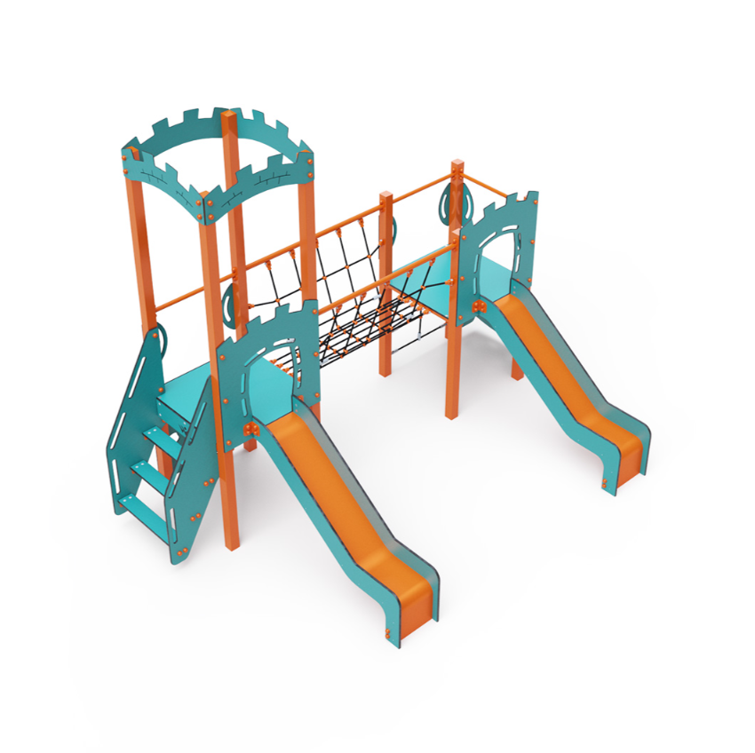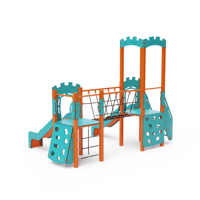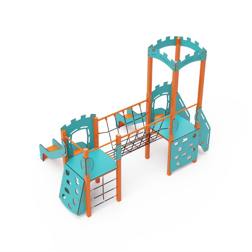 Dvouvěžová kombinovaná sestava – dvě věže propojené lanovým balančním můstkem. Na sestavu děti vylezou po schůdcích, po šikmé nebo kolmé lezecké stěně s úchyty nebo po lanové síti a dolů se mohou spustit po jedné ze dvou skluzavek. Tyrkysově-oranžový design už z dálky láká ke hře. Ocelová konstrukce je odolná vůči povětrnostním vlivem díky žárovému zinkování a lakování odolnou práškovou barvou. Použitý HPL materiál je chemicky odolný, odolný vůči UV záření – stálobarevný, netoxický, recyklovatelný a nelámavý. Nehrozí tak poranění dětí ostrými hranami nebo úlomky. Lana jsou vyrobena z polyesterových vláken, která jsou vinuta kolem středové výztuže. Tato konstrukce lana zvyšuje jeho pevnost a odolnost proti mechanickému namáhání.