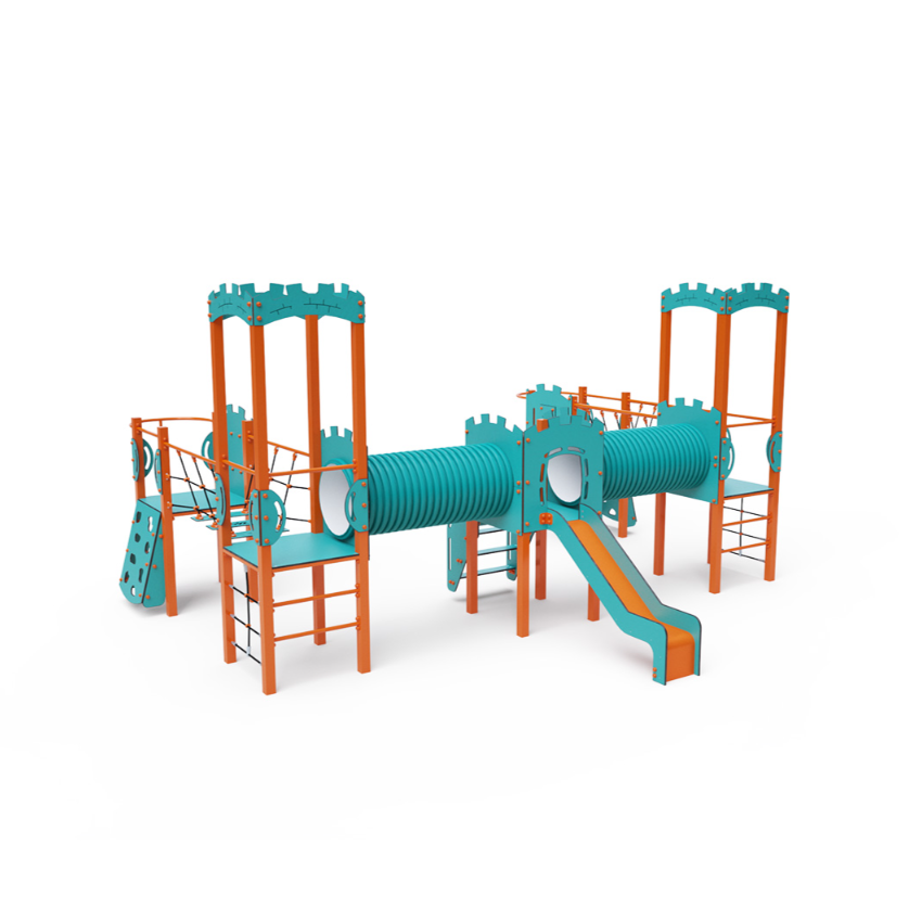 Pětivěžová kombinovaná sestava - dvě věže s hradbami a tři nízké věže jsou propojeny lanovým můstkem, lanovým balančním můstkem a dvěma tunely. Sestava obsahuje schůdky, šikmé lezecké stěny, lezecké tyče, kolmé lanové sítě, žebříky a skluzavku. Tyrkysově-oranžový design už z dálky láká ke hře. Ocelová konstrukce je odolná vůči povětrnostním vlivům díky žárovému zinkování a lakování odolnou práškovou barvou. Použitý HPL materiál je chemicky odolný, odolný vůči UV záření – stálobarevný, netoxický, recyklovatelný a nelámavý. Nehrozí tak poranění dětí ostrými hranami nebo úlomky. Lana jsou vyrobena z polyesterových vláken, která jsou vinuta kolem středové výztuže. Tato konstrukce lana zvyšuje jeho pevnost a odolnost proti mechanickému namáhání.