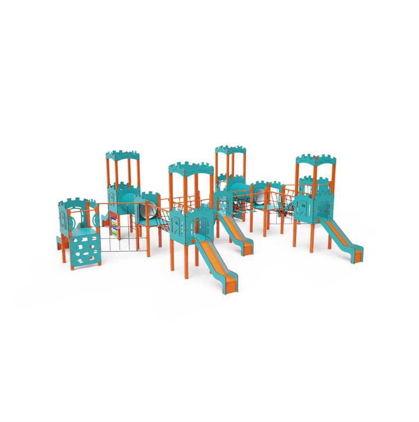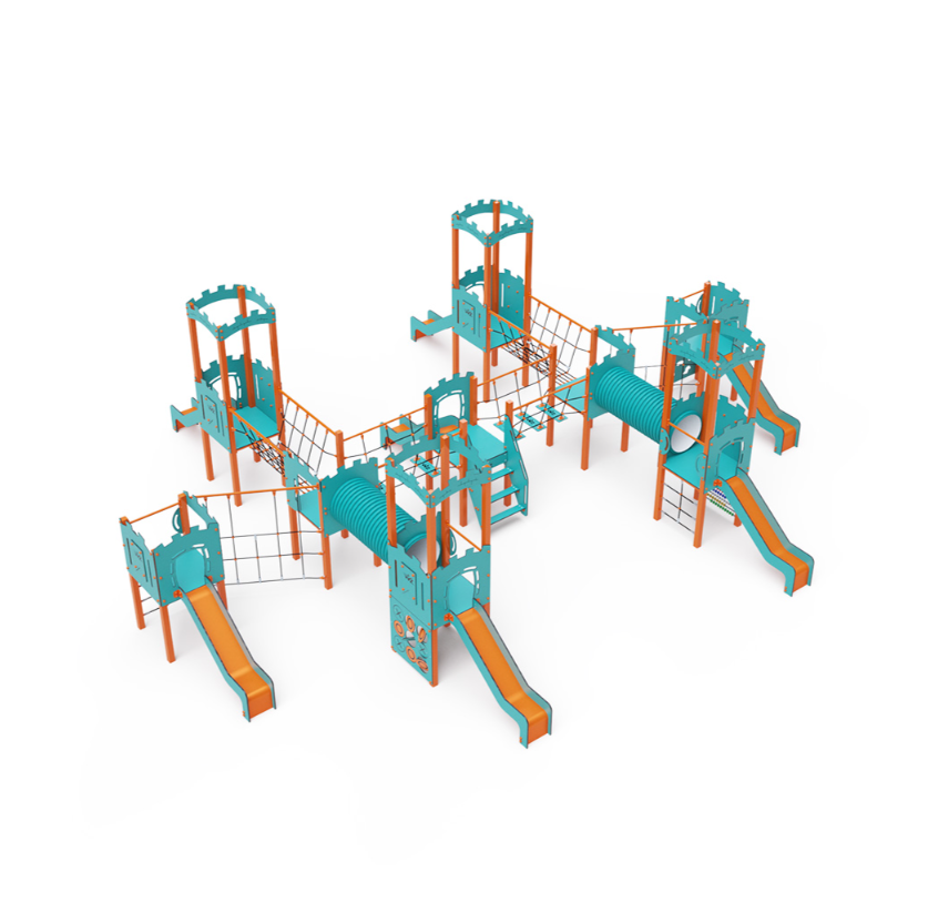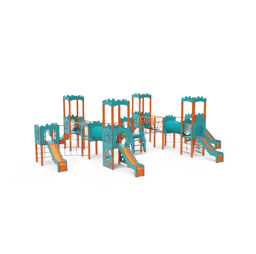Devítivěžová kombinovaná sestava – čtyři věže s hradbami a pět nízkých věží jsou propojeny lanovými můstky, lanovými balančními můstky a diagonálními lanovími stěnami. Sestava obsahuje schůdky, kolmou lezeckou stěnu, kolmou lanovou síť, piškvorky, počítadlo a sedm skluzavek. Tyrkysově-oranžový design už z dálky láká ke hře. Ocelová konstrukce je odolná vůči povětrnostním vlivům díky žárovému zinkování a lakování odolnou práškovou barvou. Použitý HPL materiál je chemicky odolný, odolný vůči UV záření – stálobarevný, netoxický, recyklovatelný a nelámavý. Nehrozí tak poranění dětí ostrými hranami nebo úlomky. Lana jsou vyrobena z polyesterových vláken, která jsou vinuta kolem středové výztuže. Tato konstrukce lana zvyšuje jeho pevnost a odolnost proti mechanickému namáhání.