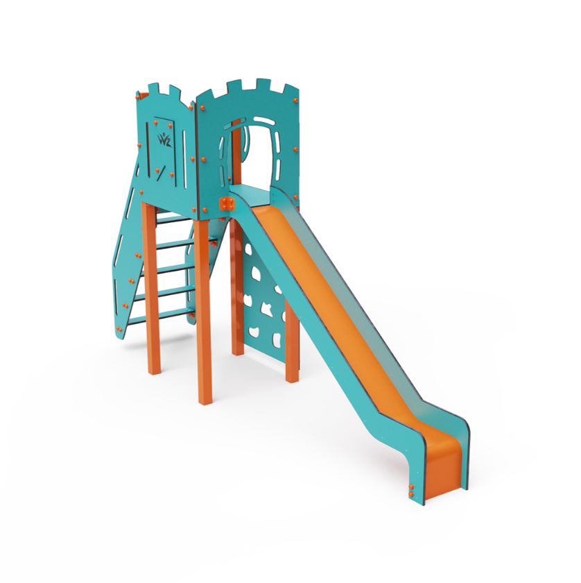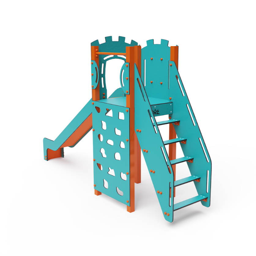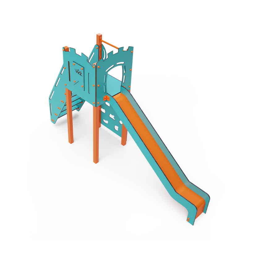 Jednověžová kombinovaná sestava – věž, na kterou děti vylezou po schůdcích nebo po lezecké stěně a dolů se mohou spustit po skluzavce. Tyrkysově-oranžový design již z dálky láká ke hře. Ocelová konstrukce je odolná vůči povětrnostním vlivům díky žárovému zinkování a lakování odolnou práškovou barvou. Použitý HPL materiál je chemicky odolný, odolný vůči UV záření – stálobarevný, netoxický, recyklovatelný a nelámavý. Nehrozí tak poranění dětí ostrými hranami nebo úlomky. Všechny spoje jsou nerezové a zakryté plastovými krytkami pro zvýšení životnosti a bezpečnosti.