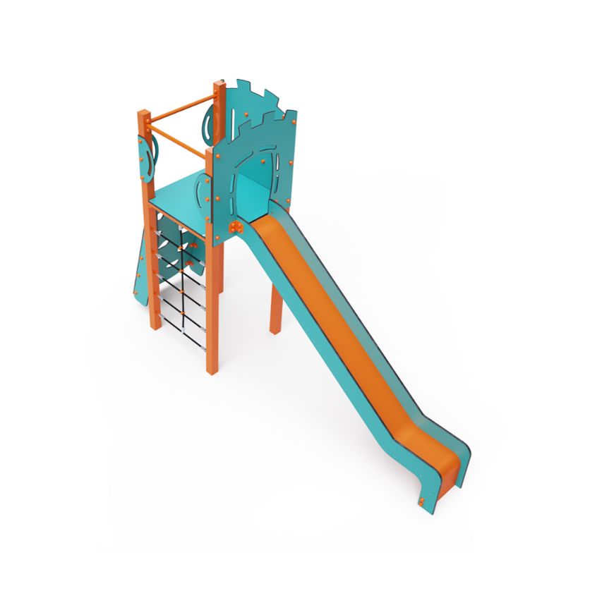 Jednověžová kombinovaná sestava – věž, na kterou děti vylezou po lanové lezecké stěně nebo po lezecké stěně s úchyty a dolů se mohou spustit po skluzavce. Tyrkysově-oranžový design už z dálky láká ke hře. Ocelová konstrukce je odolná vůči povětrnostním vlivům díky žárovému zinkování a lakování odolnou práškovou barvou. Použitý HDPE plast je chemicky odolný, odolný vůči UV záření – stálobarevný, netoxický, recyklovatelný a nelámavý. Nehrozí tak poranění dětí ostrými hranami nebo úlomky. Lana jsou vyrobena z polyesterových vláken, která jsou vinuta kolem středové výztuže. Tato konstrukce lana zvyšuje jeho pevnost a odolnost proti mechanickému namáhání.