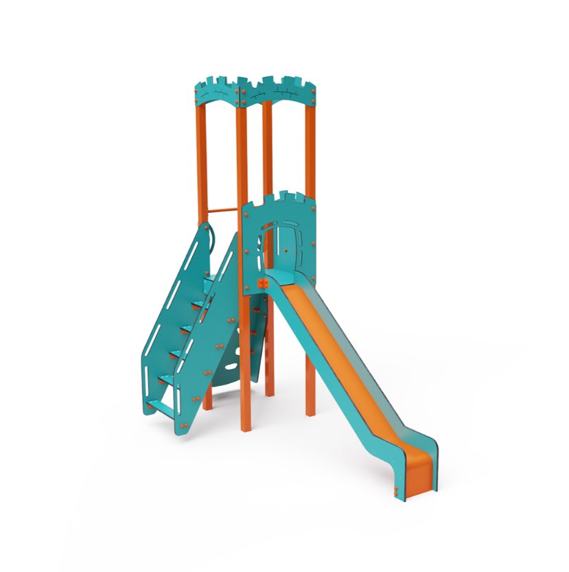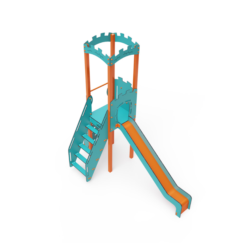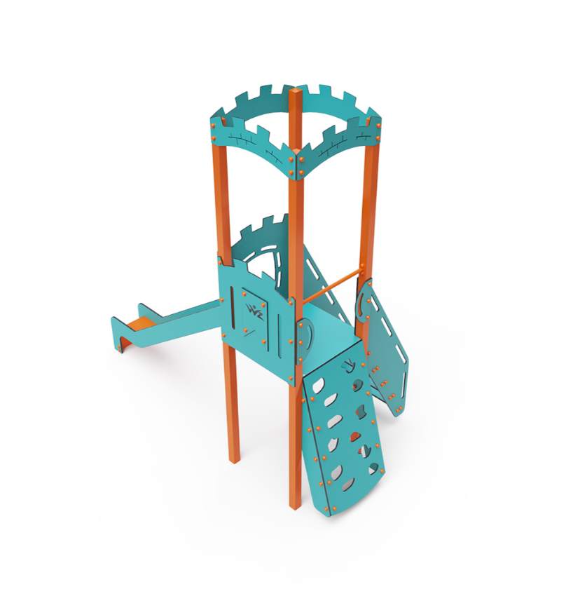 Jednověžová kombinovaná sestava – věž s hradbami, na kterou děti vylezou po schůdcích nebo po lezecké stěně s úchyty a dolů se mohou spustit po skluzavce. Tyrkysově-oranžový design už z dálky láká ke hře. Ocelová konstrukce je odolná vůči povětrnostním vlivům díky žárovému zinkování a lakování odolnou práškovou barvou. Použitý HPL materiál je chemicky odolný, odolný vůči UV záření – stálobarevný, netoxický, recyklovatelný a nelámavý. Nehrozí tak poranění dětí ostrými hranami nebo úlomky. Všechny spoje jsou nerezové a zakryté plastovými krytkami pro zvýšení životnosti a bezpečnosti.