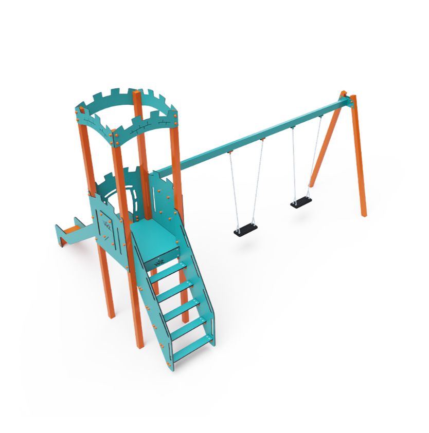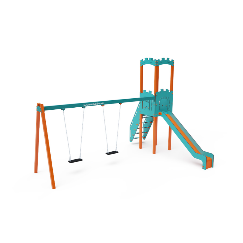 Jednověžová kombinovaná sestava – věž, na kterou děti vylezou po schůdcích a dolů se mohou spustit po jedné ze dvou skluzavek. Součástí herní sestavy je ráhno houpačky se dvěma sedáky Klasik, Baby nebo jejich kombinace. Tyrkysově-oranžový design už z dálky láká ke hře. Ocelová konstrukce je odolná vůči povětrnostním vlivům díky žárovému zinkování a lakování odolnou práškovou barvou. Použitý HPL materiál je chemicky odolný, odolný vůči UV záření – stálobarevný, netoxický, recyklovatelný nelámavý. Nehrozí tak poranění dětí ostrými hranami nebo úlomky. Lana jsou vyrobena z polyesterových vláken, která jsou vinutá kolem středové výztuže. Tato konstrukce lana zvyšuje jeho pevnost a odolnost proti mechanickému namáhání.