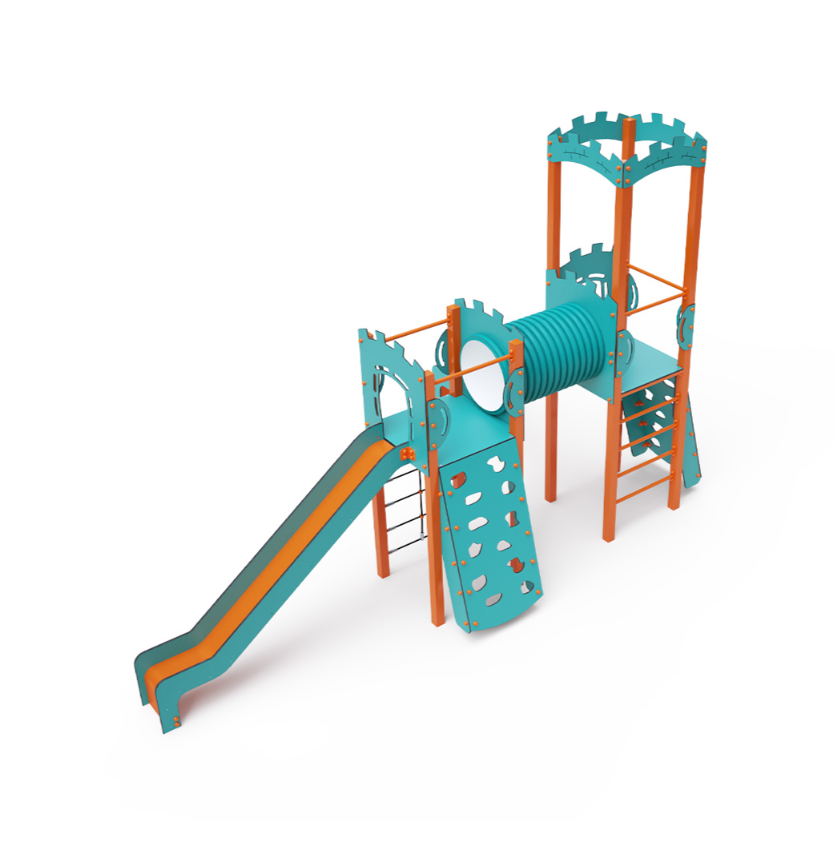 Dvouvěžová kombinovaná sestava – dvě věže propojené tunelem. Na sestavu děti vylezou po jedné ze dvou lezeckých stěn s úchyty, po lanové síti nebo žebříku a dolů se mohou spustit po jedné ze dvou skluzavek. Tyrkysově-oranžový design už z dálky láká ke hře. Ocelová konstrukce je odolná vůči povětrnostním vlivům díky žárovému zinkování a lakování odolnou práškovou barvou. Použitý HPL materiál je chemicky odolný, odolný vůči UV záření – stálobarevný, netoxický, recyklovatelný a nelámavý. Nehrozí tak poranění dětí ostrými hranami nebo úlomky. Lana jsou vyrobena z polyesterových vláken, která jsou vinutá kolem středové výztuže. Tato konstrukce lana zvyšuje jeho pevnost a odolnost proti mechanickému namáhání.