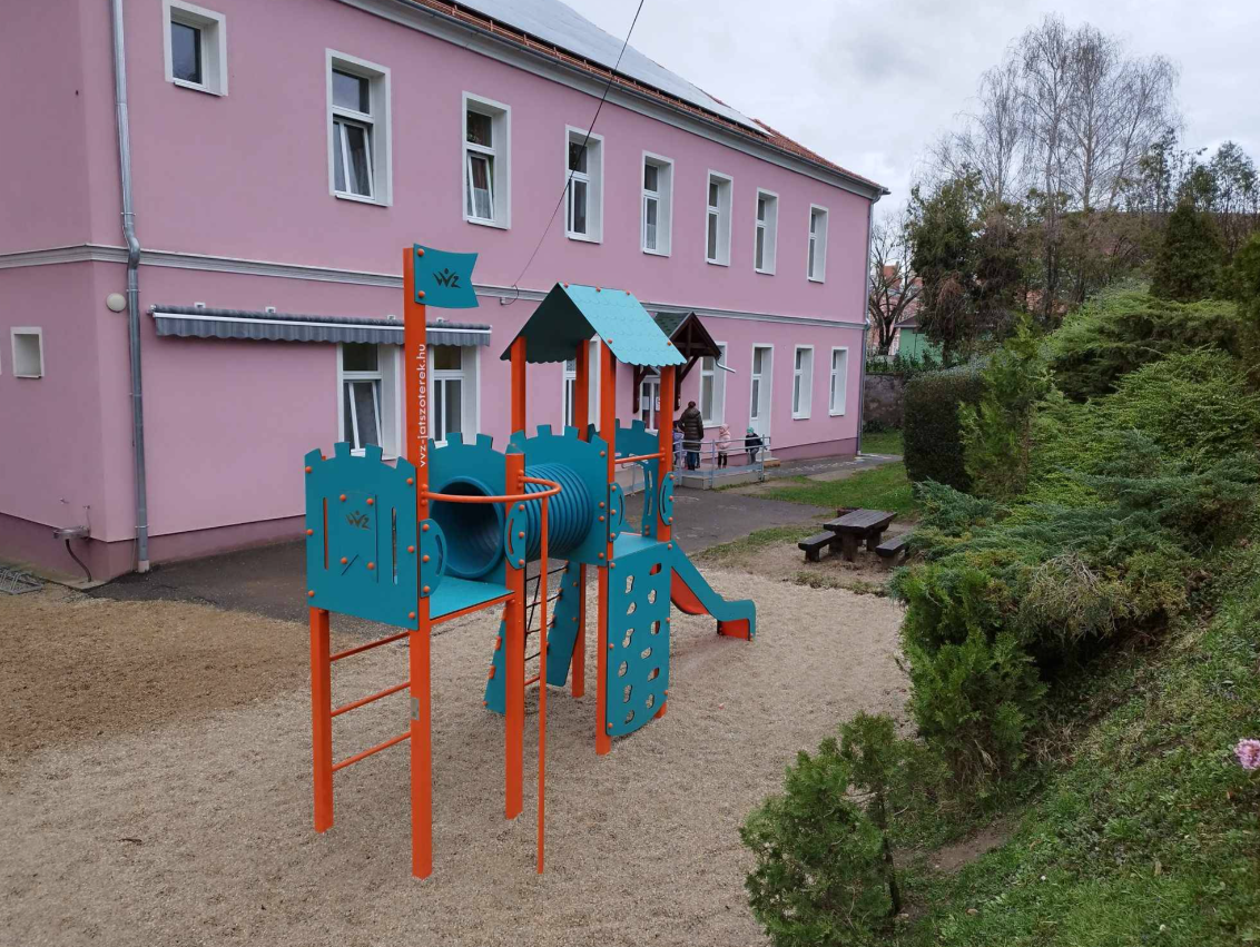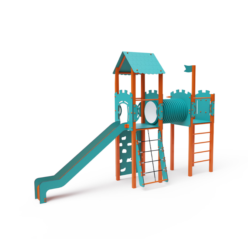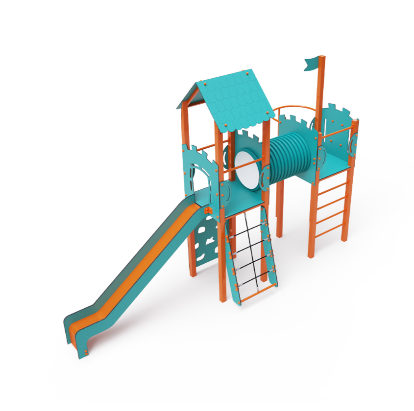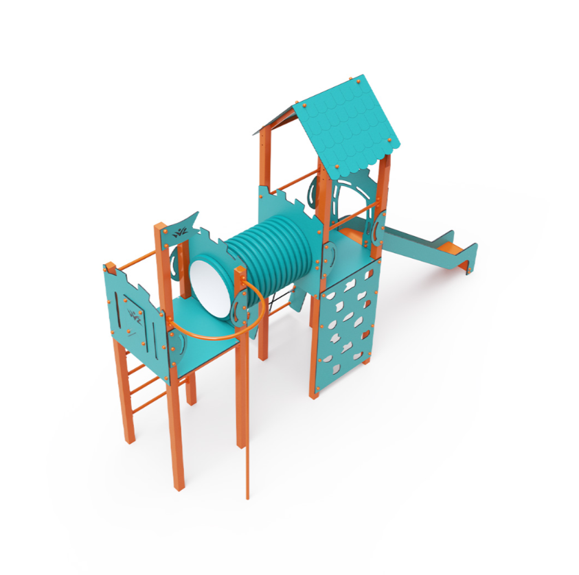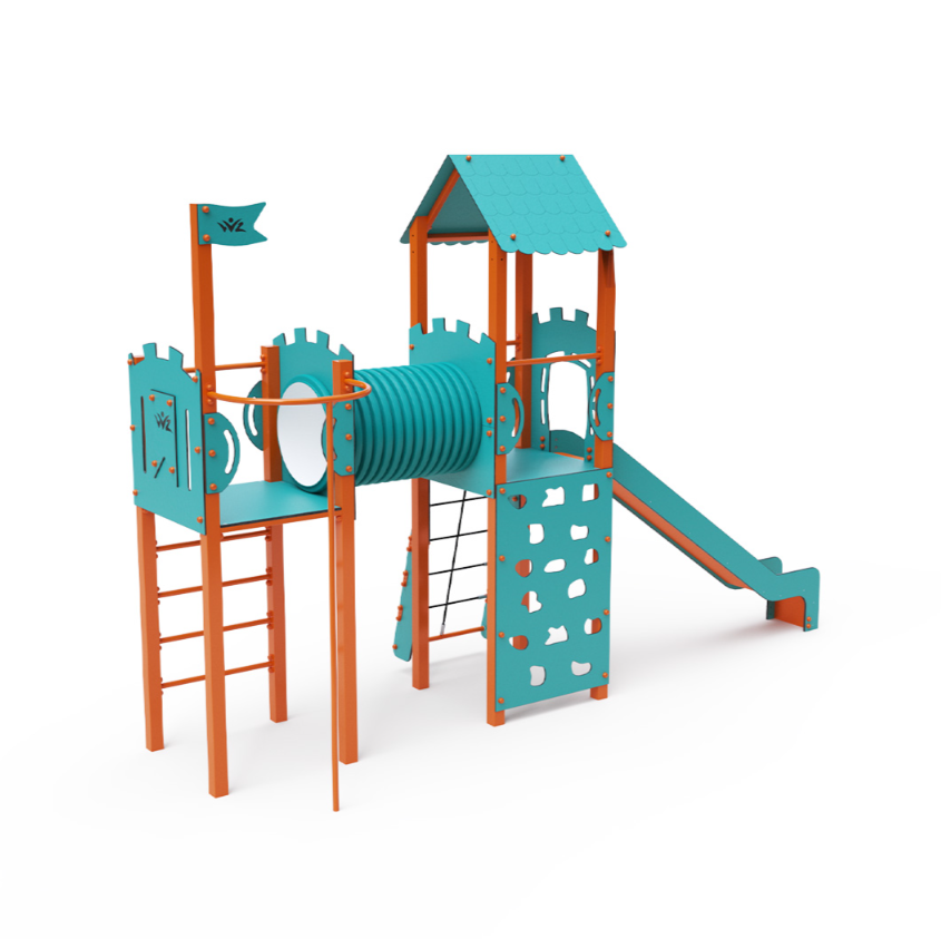 Dvouvěžová kombinovaná sestava – jedna věž se stříškou a druhá nízká se stínítkem ve tvaru zástavy jsou propojeny tunelem. Na sestavu děti vylezou po lezecké stěně s úchyty, po obloukové lanové síti nebo po žebříkovém výlezu a dolů se mohou spustit po skluzavce nebo po šplhací tyči. Tyrkysově-oranžový design už z dálky láká ke hře. Ocelová konstrukce je odolná vůči povětrnostním vlivům díky žárovému zinkování a lakování odolnou práškovou barvou. Použitý HPL materiál je chemicky odolný, odolný vůči UV záření – stálobarevný, netoxický, recyklovatelný a nelámavý. Nehrozí tak poranění dětí ostrými hranami nebo úlomky. Lana jsou vyrobena z polyesterových vláken, která jsou vinuta kolem středové výztuže. Tato konstrukce lana zvyšuje jeho pevnost a odolnost proti mechanickému namáhání.