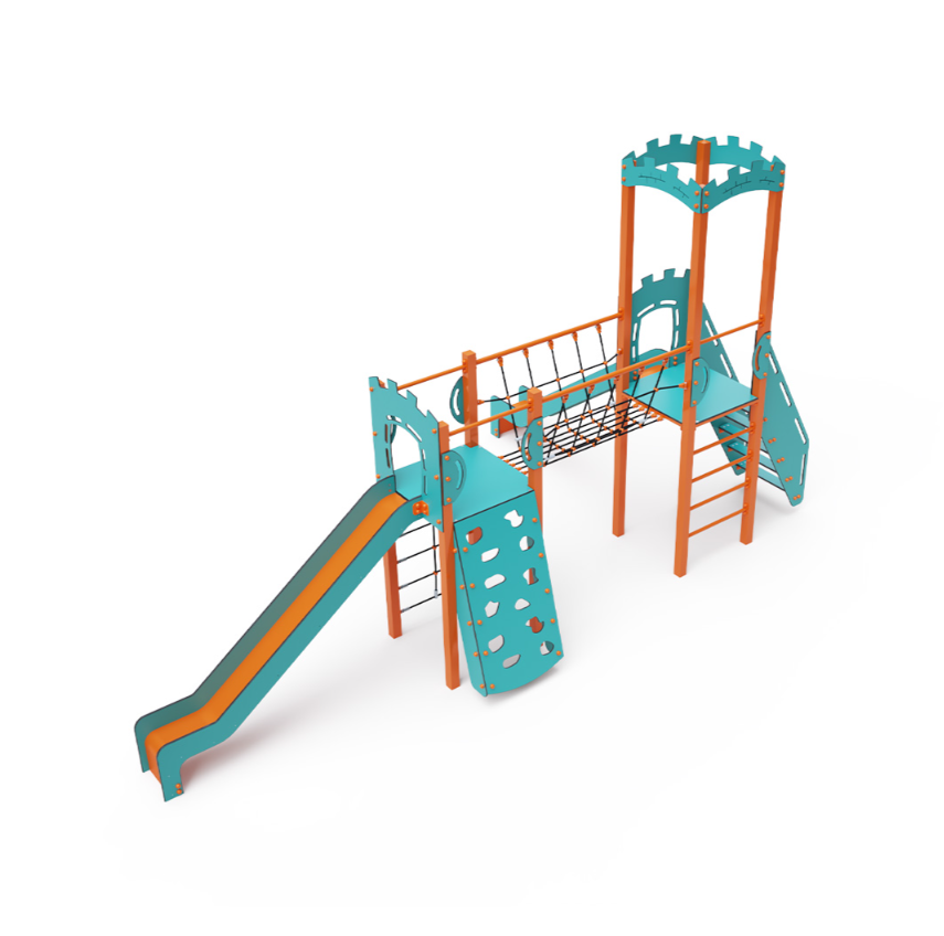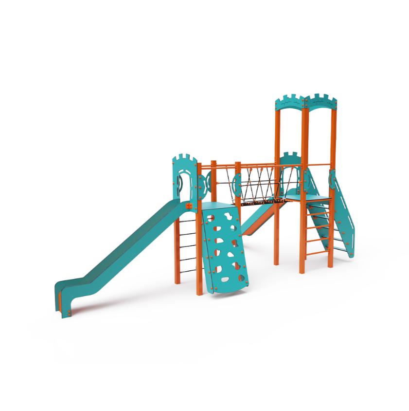Dvouvěžová kombinovaná sestava – dvě věže propojené lanovým balančním můstkem. Na sestavu děti vylezou po lezecké stěně s úchyty, po žebříku, lanové síti nebo po schůdcích a dolů se mohou spustit po jedné ze dvou skluzavek. Tyrkysově-oranžový design již z dálky láká ke hře. Ocelová konstrukce je odolná vůči povětrnostním vlivům díky žárovému zinkování a lakování odolnou práškovou barvou. Použitý HPL materiál je chemicky odolný, odolný vůči UV záření – stálobarevný, netoxický, recyklovatelný a nelámavý. Nehrozí tak poranění dětí ostrými hranami nebo úlomky. Lana jsou vyrobena z polyesterových vláken, která jsou vinuta kolem středové výztuže. Tato konstrukce lana zvyšuje jeho pevnost a odolnost proti mechanickému namáhání.