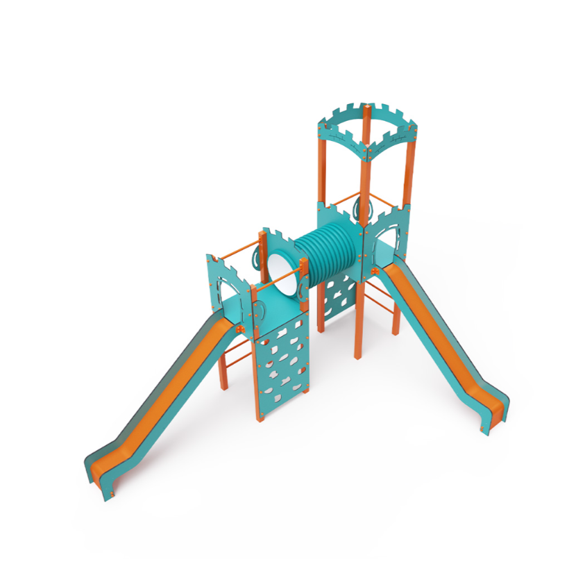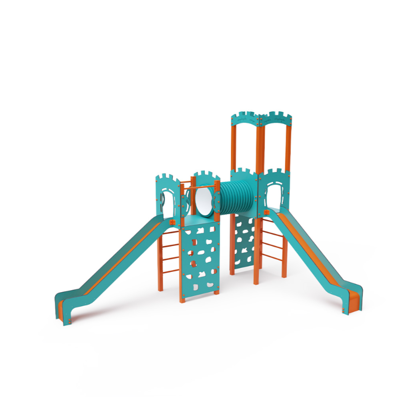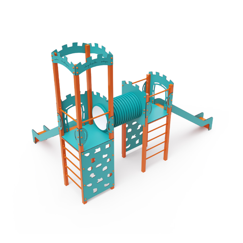 Dvouvěžová kombinovaná sestava – jedna věž s hradbami, druhá nízká jsou propojeny tunelem. Na sestavu děti vylezou po lezecké stěně s úchyty, po žebříku, po schůdcích nebo obloukové lanové síti a dolů se mohou spustit po jedné ze dvou skluzavek. Tyrkysově-oranžový design už z dálky láká ke hře. Ocelová konstrukce je odolná vůči povětrnostním vlivům díky žárovému zinkování a lakování odolnou práškovou barvou. Použitý HPL materiál je chemicky odolný, odolný vůči UV záření – stálobarevný, netoxický, recyklovatelný a nelámavý. Nehrozí tak poranění dětí ostrými hranami nebo úlomky. Všechny spoje jsou nerezové a zakryté plastovými krytkami pro zvýšení životnosti a bezpečnosti.