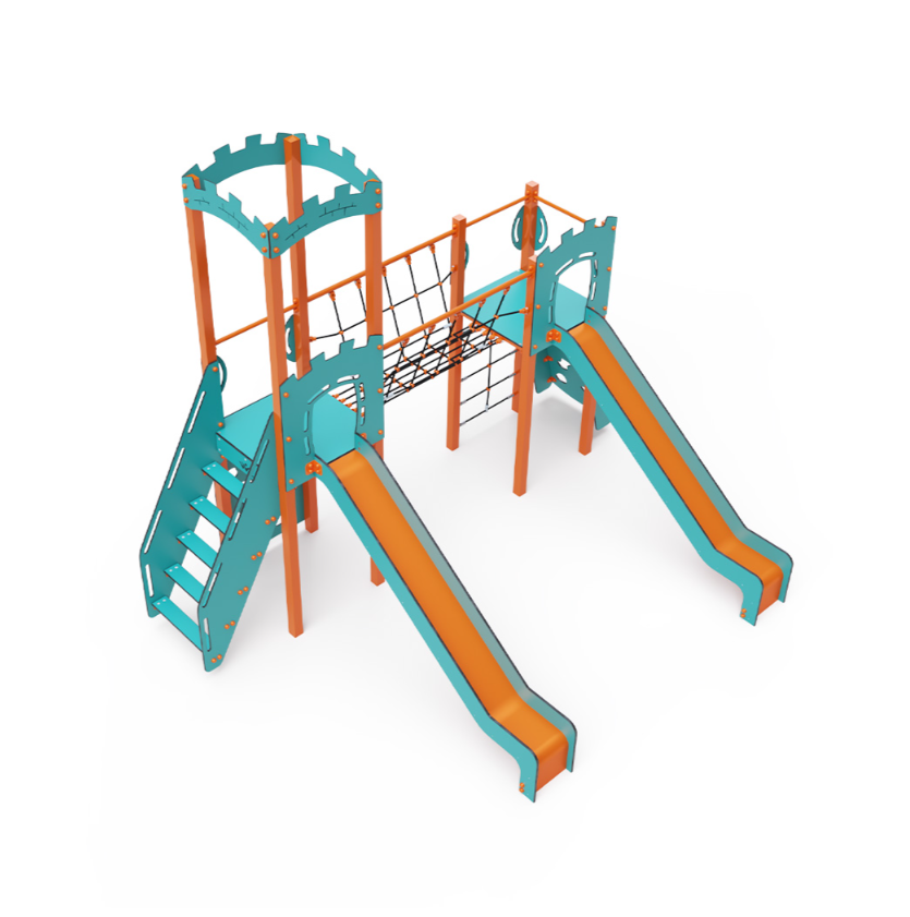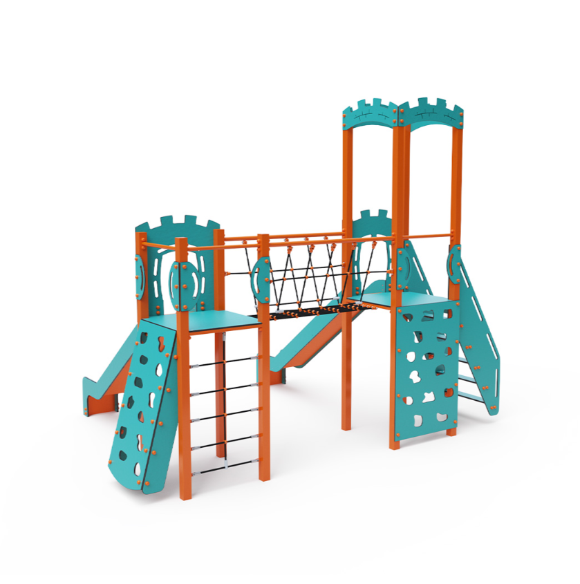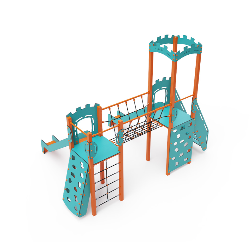 Dvouvěžová kombinovaná sestava – dvě věže propojené lanovým balančním můstkem. Na sestavu děti vylezou po schůdcích, po šikmé nebo kolmé lezecké stěně s úchyty nebo po lanové síti a dolů se mohou spustit po jedné ze dvou skluzavek. Tyrkysově-oranžový design už z dálky láká ke hře. Ocelová konstrukce je odolná vůči povětrnostním vlivem díky žárovému zinkování a lakování odolnou práškovou barvou. Použitý HPL materiál je chemicky odolný, odolný vůči UV záření – stálobarevný, netoxický, recyklovatelný a nelámavý. Nehrozí tak poranění dětí ostrými hranami nebo úlomky. Lana jsou vyrobena z polyesterových vláken, která jsou vinuta kolem středové výztuže. Tato konstrukce lana zvyšuje jeho pevnost a odolnost proti mechanickému namáhání.