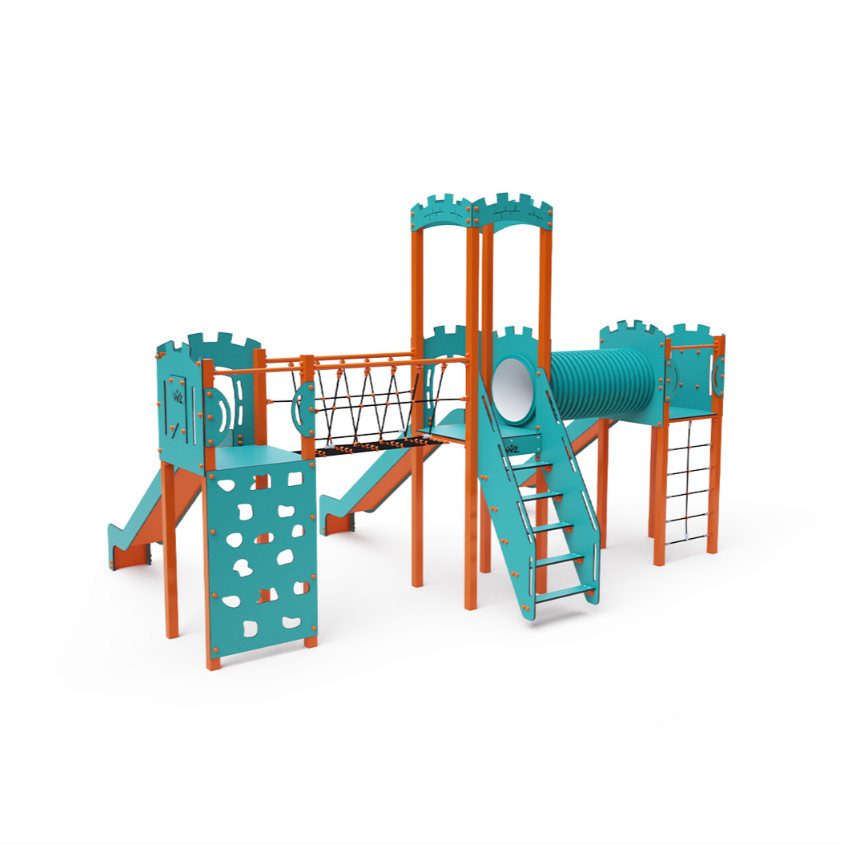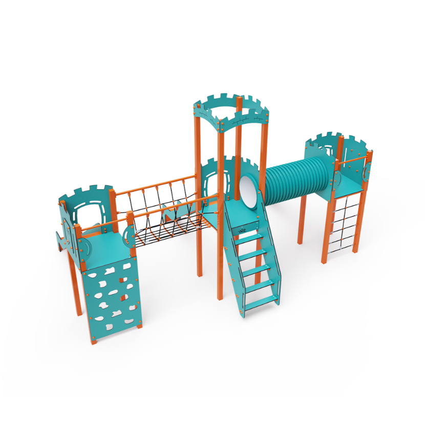 Třívěžová kombinovaná sestava – dvě věže jsou propojeny se střední věží s hradbami lanovým můstkem a tunelem. Na sestavu děti vylezou po schůdcích, po kolmé lezecké stěně s úchyty nebo po lanové síti a dolů se mohou spustit po jedné ze tří skluzavek. Tyrkysově-oranžový design už z dálky láká ke hře. Ocelová konstrukce je odolná vůči povětrnostním vlivům díky žárovému zinkování a lakování odolnou práškovou barvou. Použitý HPL materiál je chemicky odolný, odolný vůči UV záření – stálobarevný, netoxický, recyklovatelný a nelámavý. Nehrozí tak poranění dětí ostrými hranami nebo úlomky. Lana jsou vyrobena z polyesterových vláken, která jsou vinuta kolem středové výztuže. Tato konstrukce lana zvyšuje jeho pevnost a odolnost proti mechanickému namáhání.