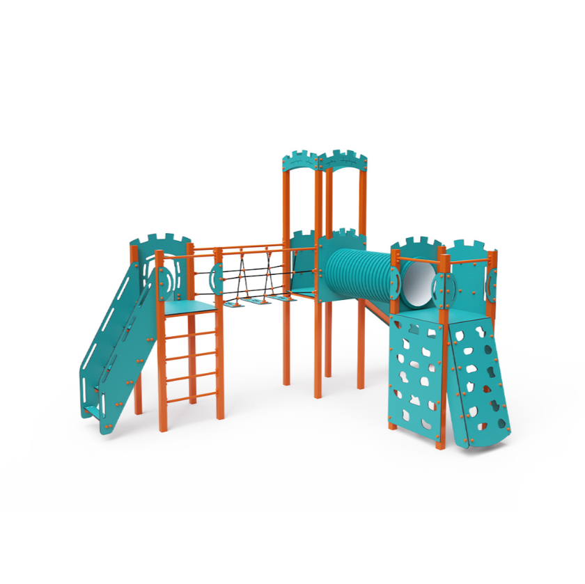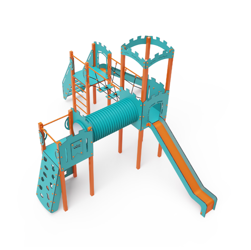 Třívěžová kombinovaná sestava ve tvaru písmene L. Dvě věže jsou propojeny se střední věží s hradbami lanovým balančním můstkem a tunelem. Na sestavu děti vylezou po schůdcích, po šikmé lezecké stěně s úchyty nebo po žebříku a dolů se mohou spustit po jedné ze dvou skluzavek. Tyrkysově-oranžový design už z dálky láká ke hře. Ocelová konstrukce je odolná vůči povětrnostním vlivům díky žárovému zinkování a lakování odolnou práškovou barvou. Použitý HPL materiál je chemicky odolný, odolný vůči UV záření – stálobarevný, netoxický, recyklovatelný a nelámavý. Nehrozí tak poranění dětí ostrými hranami nebo úlomky. Lana jsou vyrobena z polyesterových vláken, která jsou vinutá kolem středové výztuže. Tato konstrukce lana zvyšuje jeho pevnost a odolnost proti mechanickému namáhání.