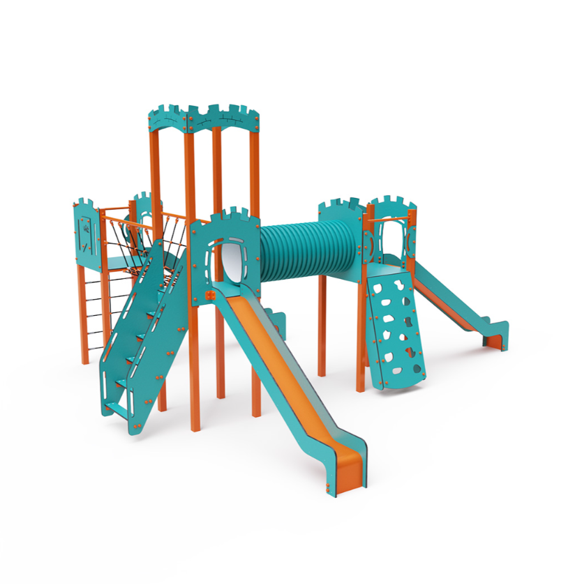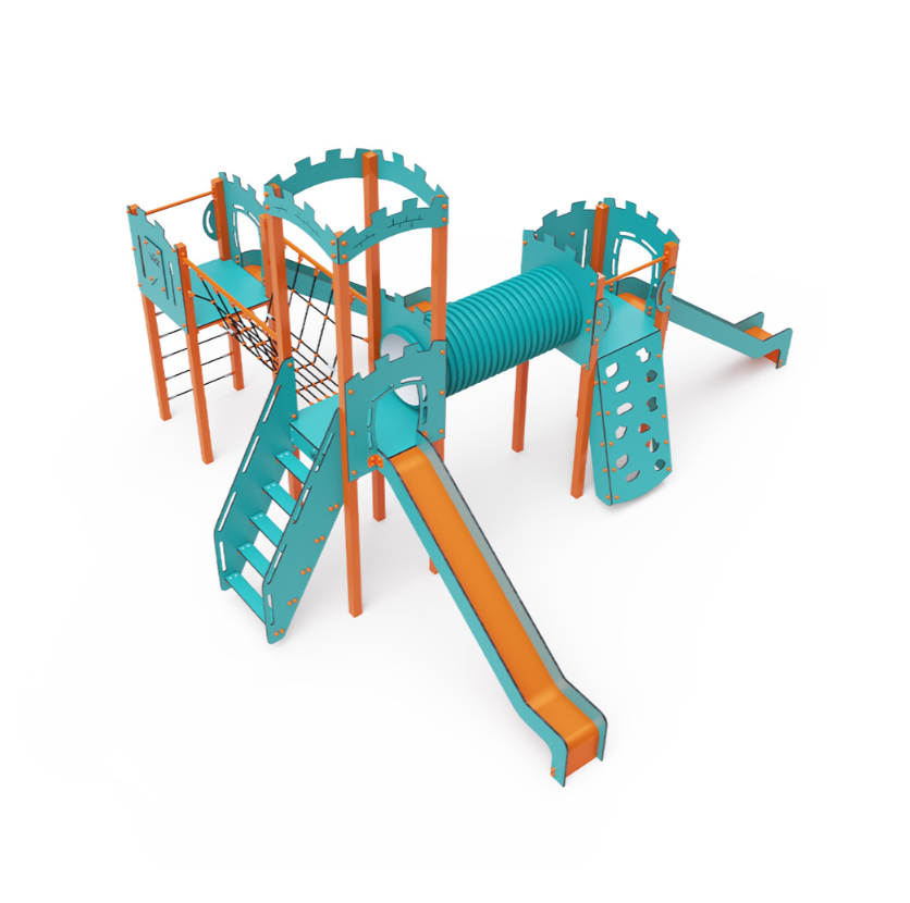 Třívěžová kombinovaná sestava ve tvaru písmene L. Dvě věže jsou propojeny se střední věží s hradbami lanovým můstkem a tunelem. Na sestavu děti vylezou po schůdcích, po šikmé lezecké stěně s úchyty a lanem nebo po lanové síti a dolů se mohou spustit po jedné ze tří skluzavek. Tyrkysově-oranžový design už z dálky láká ke hře. Ocelová konstrukce je odolná vůči povětrnostním vlivům díky žárovému zinkování a lakování odolnou práškovou barvou. Použitý HPL materiál je chemicky odolný, odolný vůči UV záření – stálobarevný, netoxický, recyklovatelný a nelámavý. Nehrozí tak poranění dětí ostrými hranami nebo úlomky. Lana jsou vyrobena z polyesterových vláken, která jsou vinutá kolem středové výztuže. Tato konstrukce lana zvyšuje jeho pevnost a odolnost proti mechanickému namáhání.