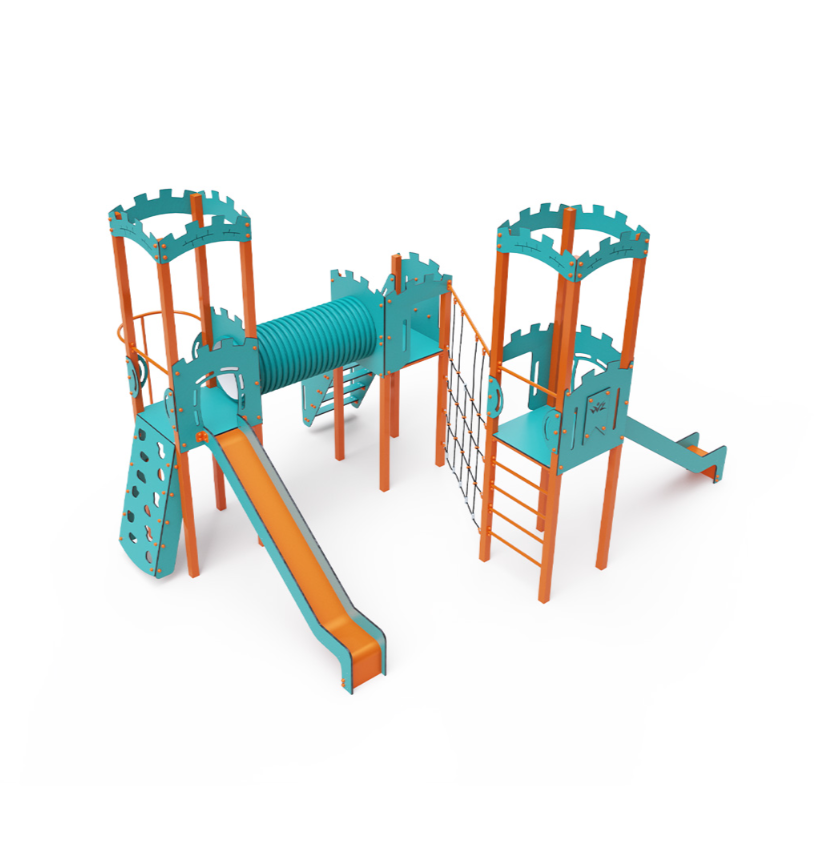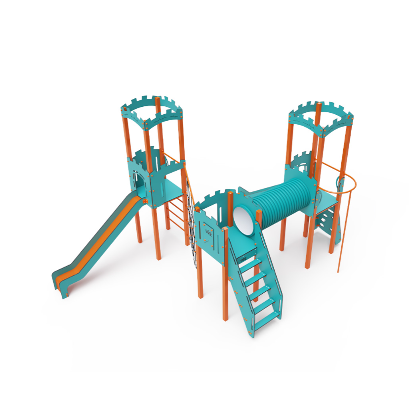 Třívěžová kombinovaná sestava ve tvaru písmene L. Dvě věže s hradbami jsou propojeny se střední věží diagonální lanovou stěnou a tunelem. Na sestavu děti vylezou po schůdcích, po šikmé lezecké stěně s úchyty, po lezecké tyči nebo po žebříku a dolů se mohou spustit po jedné ze dvou skluzavek nebo po lezecké tyči. Tyrkysově-oranžový design už z dálky láká ke hře. Ocelová konstrukce je odolná vůči povětrnostním vlivům díky žárovému zinkování a lakování odolnou práškovou barvou. Použitý HPL materiál je chemicky odolný, odolný vůči UV záření – stálobarevný, netoxický, recyklovatelný a nelámavý. Nehrozí tak poranění dětí ostrými hranami nebo úlomky. Lana jsou vyrobena z polyesterových vláken, která jsou vinuta kolem středové výztuže.