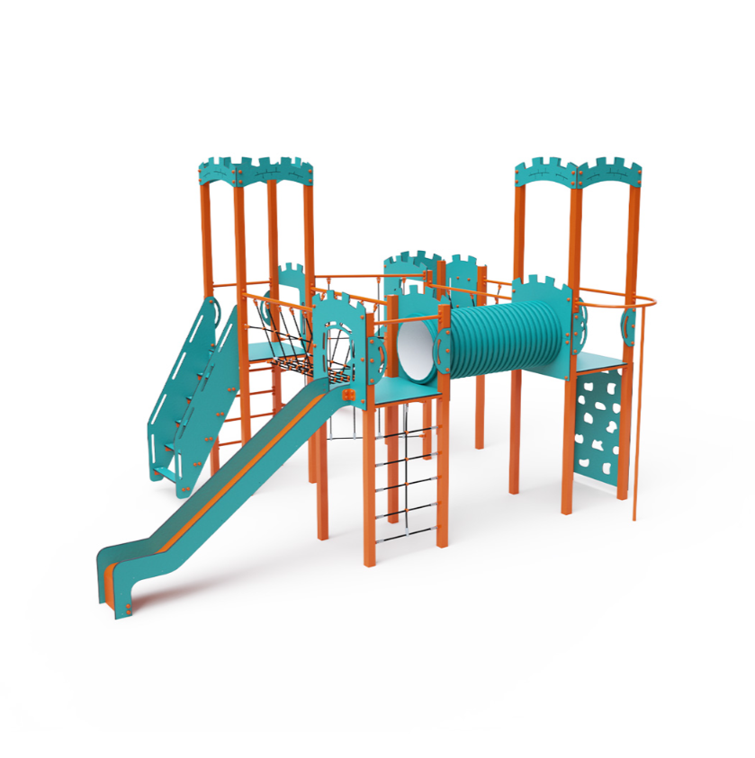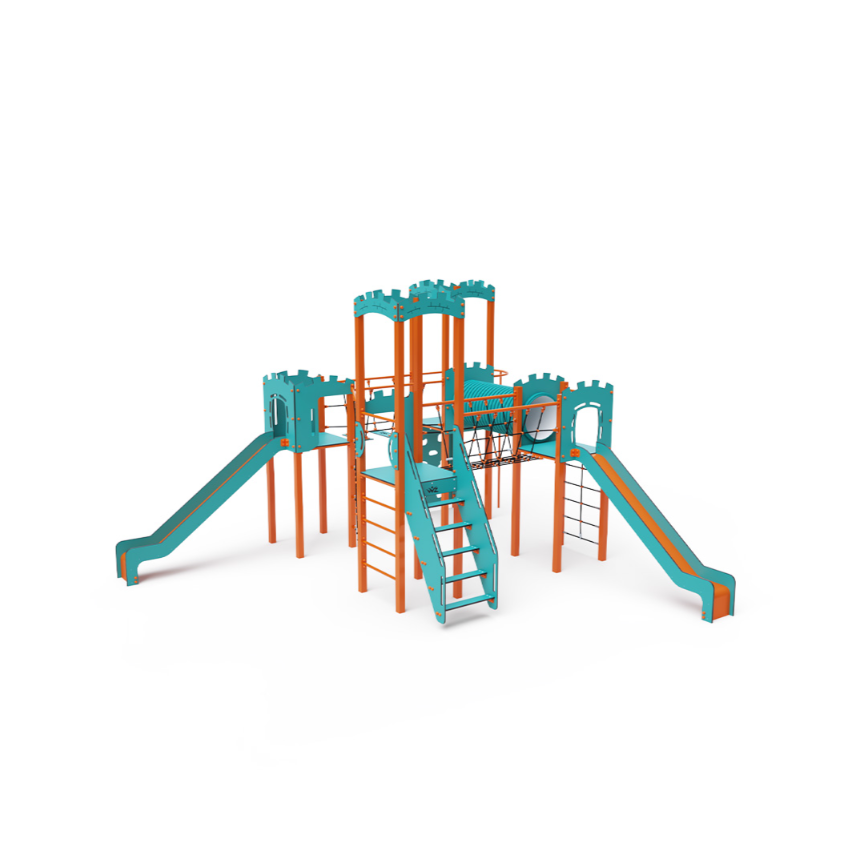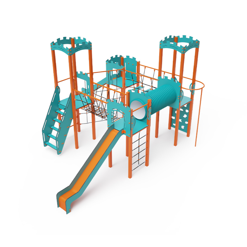 Čtyřvěžová kombinovaná sestava. Dvě věže s hradbami a dvě nízké věže jsou propojeny diagonální lanovou stěnou, lanovým balančním můstkem, lanovým můstkem a tunelem. Sestava obsahuje schůdky, kolmou lezeckou stěnu, lezeckou tyč, lanovou síť, žebřík a dvě skluzavky. Tyrkysově-oranžový design už z dálky láká ke hře. Ocelová konstrukce je odolná vůči povětrnostním vlivům díky žárovému zinkování a lakování odolnou práškovou barvou. Použitý HDPE plast je chemicky odolný, odolný vůči UV záření – stálobarevný, netoxický, recyklovatelný a nelámavý. Nehrozí tak poranění dětí ostrými hranami nebo úlomky. Lana jsou vyrobena z polyesterových vláken, která jsou vinuta kolem středové výztuže. Tato konstrukce lana zvyšuje jeho pevnost a odolnost proti mechanickému namáhání.