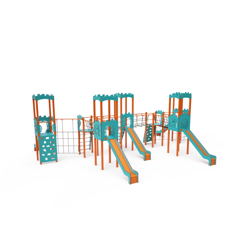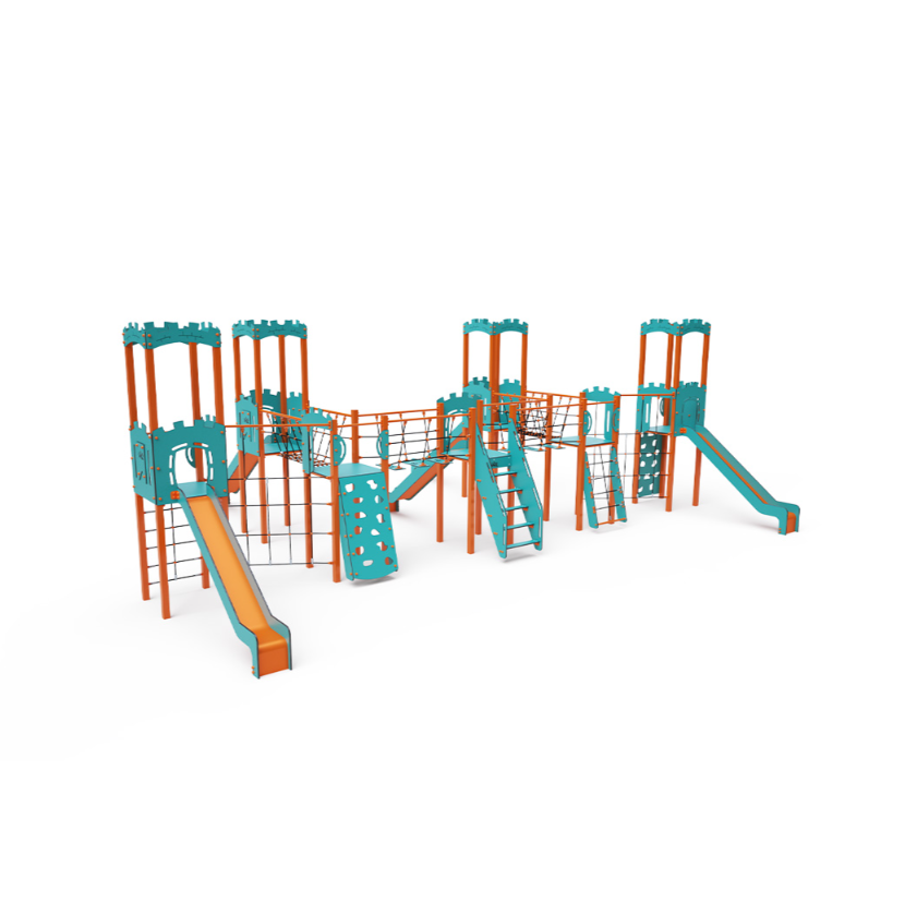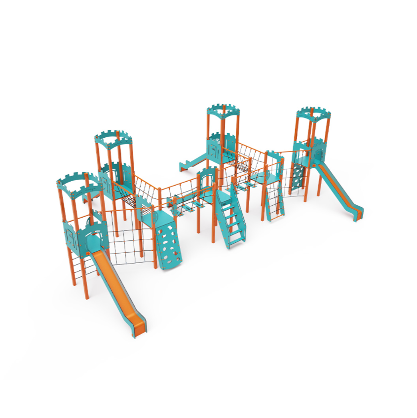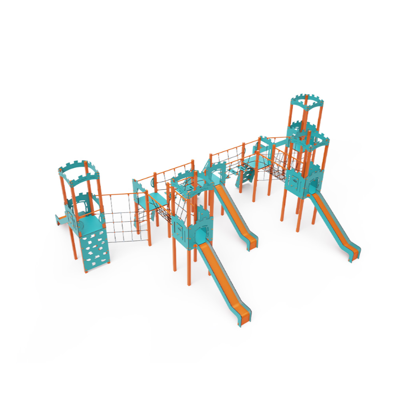 Sedmivěžová kombinovaná sestava. Čtyři věže s hradbami a tři nízké věže jsou propojeny lanovým můstkem, lanovým balančním můstkem a diagonální lanovou stěnou. Sestava obsahuje schůdky, šikmou lezeckou stěnu, šikmou lezeckou stěnu s lanem, kolmou lezeckou zeď, šikmou lanovou síť, kolmou lanovou síť a pět skluzavek. Tyrkysově-oranžový design již z dálky láká ke hře. Ocelová konstrukce je odolná vůči povětrnostním vlivům díky žárovému zinkování a lakování odolnou práškovou barvou. Použitý HPL materiál je chemicky odolný, odolný vůči UV záření – stálobarevný, netoxický, recyklovatelný a nelámavý. Nehrozí tak poranění dětí ostrými hranami nebo úlomky. Lana jsou vyrobena z polyesterových vláken, která jsou vinuta kolem středové výztuže.
