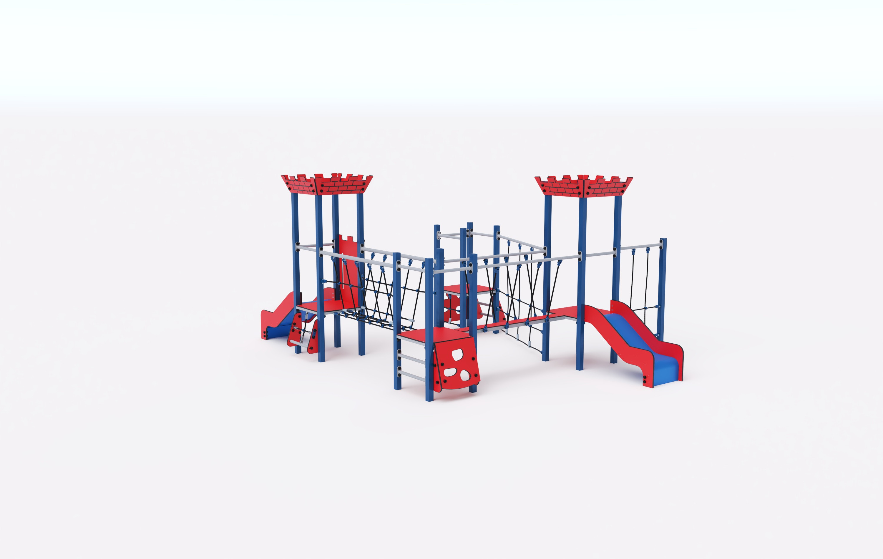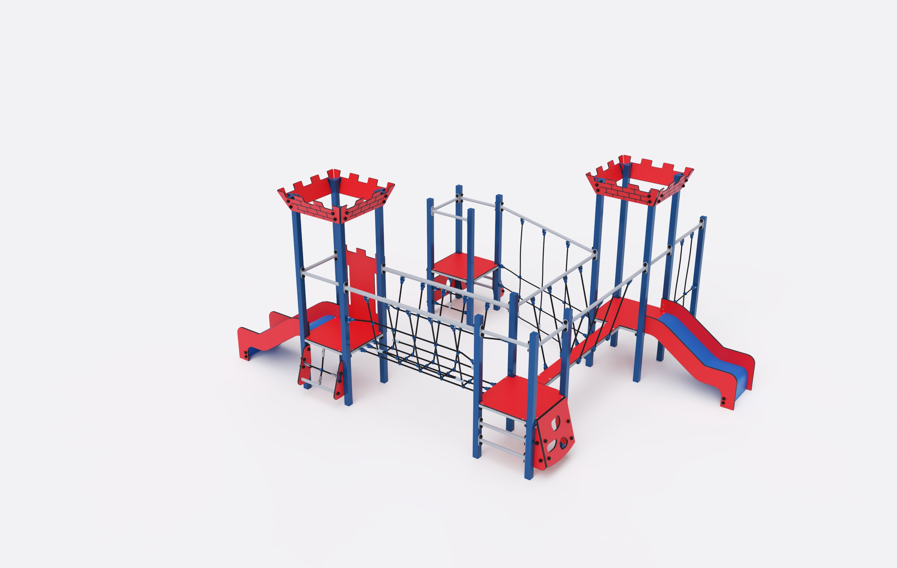Věže jsou propojené diagonálním lanovým mostem, kladinovým a lanovým mostem. Na sestavu děti vylezou po šikmém lezeckém, šikmém žebříkovém a šikmém lanovém výstupu. Ale také i po kolmém žebříkovém, kolmém lezeckém výstupu a po kolmém lanovém výstupu mimo věže, a dolů se mohou spustit po dvou skluzavkách. Tyrkysovo-oranžový design láká ke hře už z dálky. Ocelová konstrukce je odolná vůči povětrnostním vlivům díky žárovému zinkování a lakování odolnou práškovou barvou. Použitý HPL materiál je chemicky odolný, odolný vůči UV záření – stálobarevný, netoxický, recyklovatelný a nelámavý. Nehrozí tak poranění dětí ostrými hranami nebo úlomky. Všechny spoje jsou nerezové a zakryté plastovými krytkami pro zvýšení životnosti a bezpečnosti.