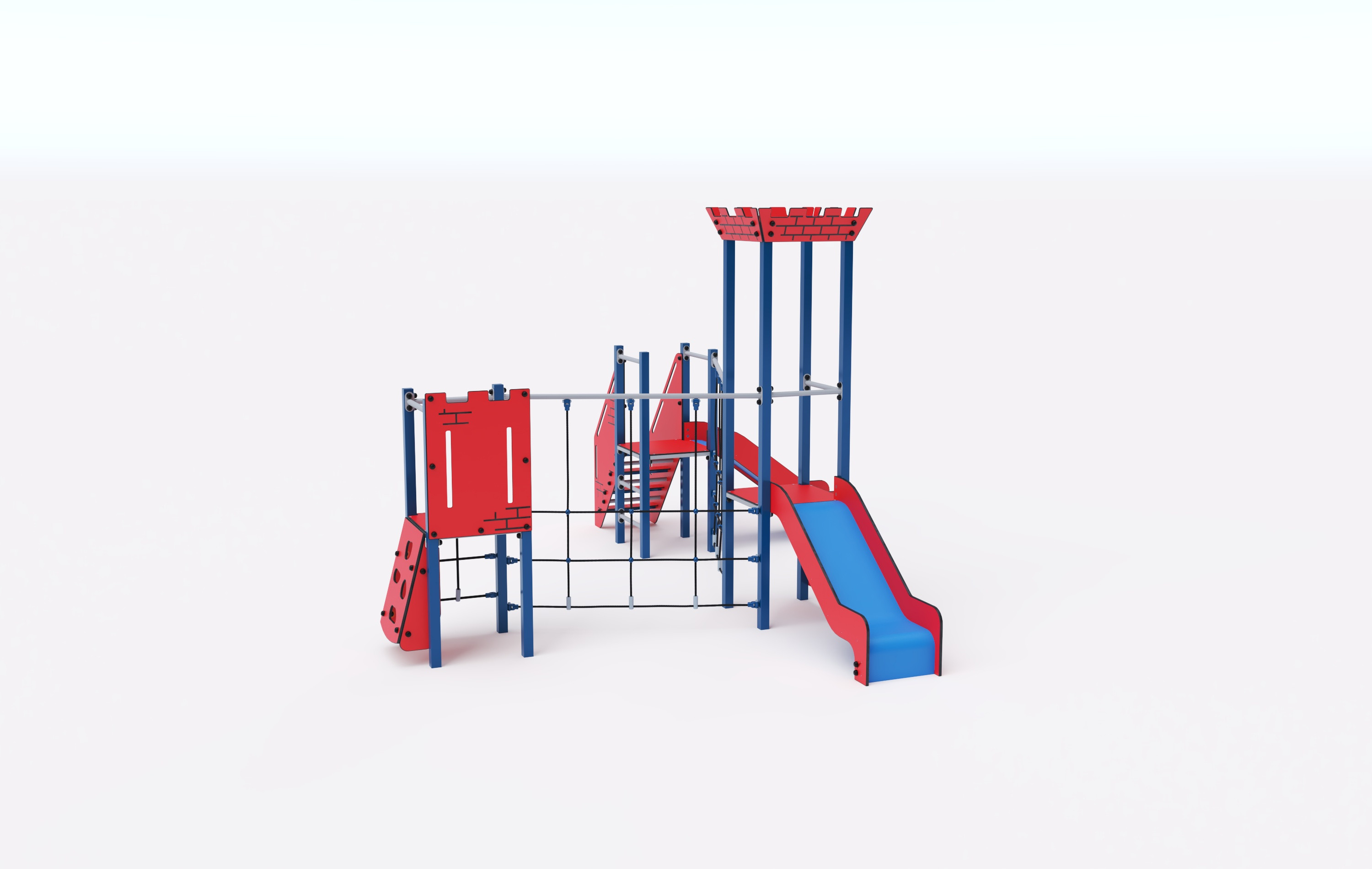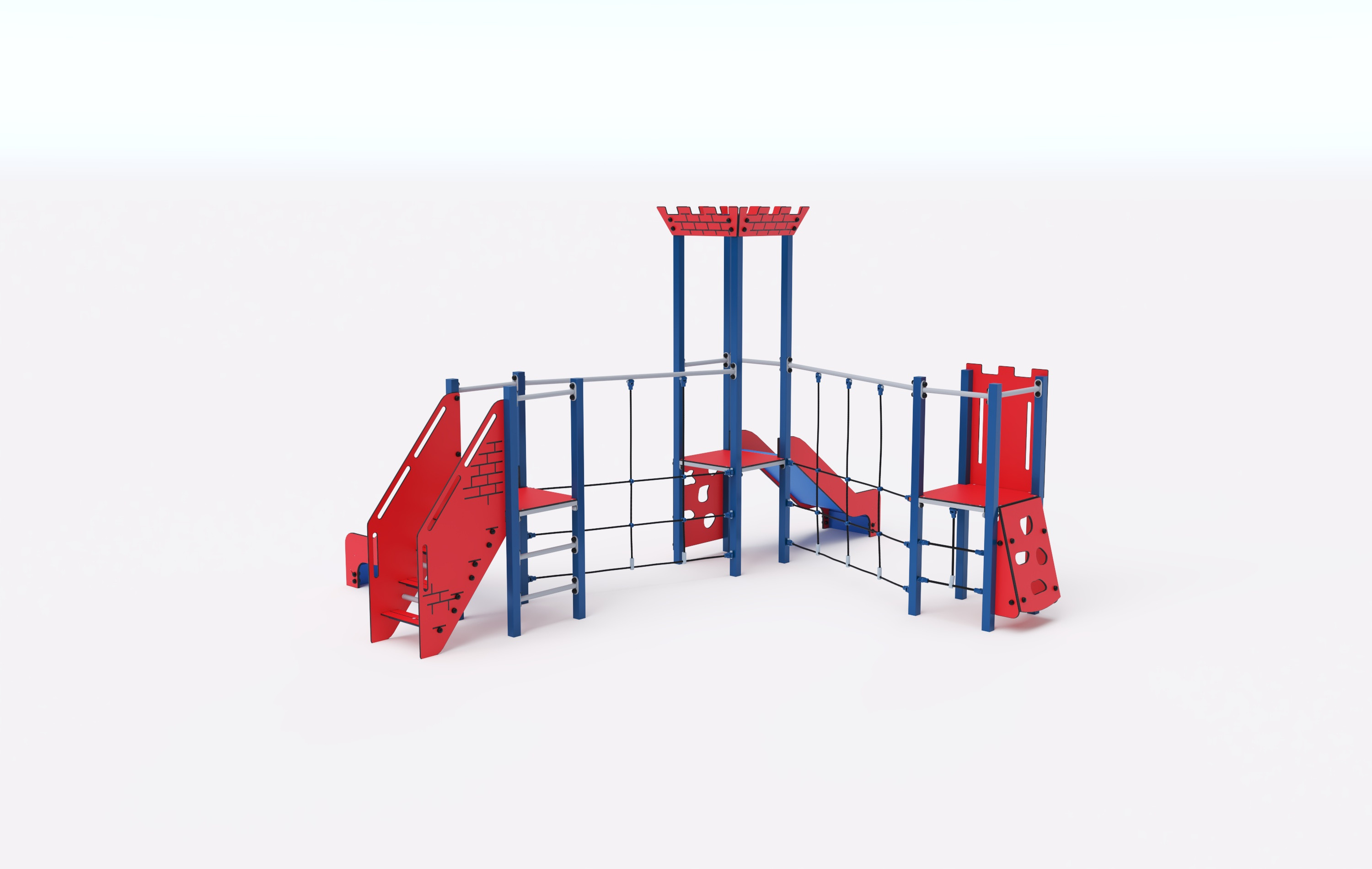 Dvě nízké věže jsou propojeny dvěma diagonálními lanovými mosty s věží s cimbuřím. Na sestavu děti vylezou po šikmém lezeckém výstupu, schodišťovém výstupu nebo kolmém lezeckém výstupu. Dolů se mohou sklouznout po dvou skluzavkách. Tyrkysovo-oranžový design láká ke hře už z dálky. Ocelová konstrukce je odolná vůči povětrnostním vlivům díky žárovému zinkování a lakování odolnou práškovou barvou. Použitý HPL materiál je chemicky odolný, odolný vůči UV záření – stálobarevný, netoxický, recyklovatelný a nelámavý. Není tak riziko poranění dětí ostrými hranami nebo úlomky. Všechny spoje jsou nerezové a zakryté plastovými krytkami pro zvýšení životnosti a bezpečnosti.