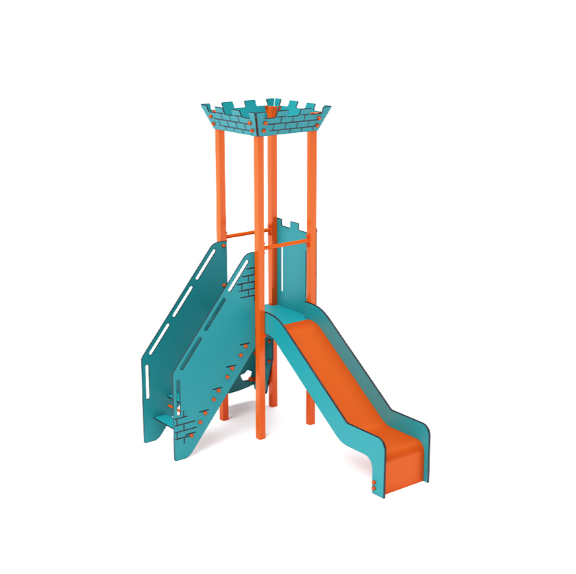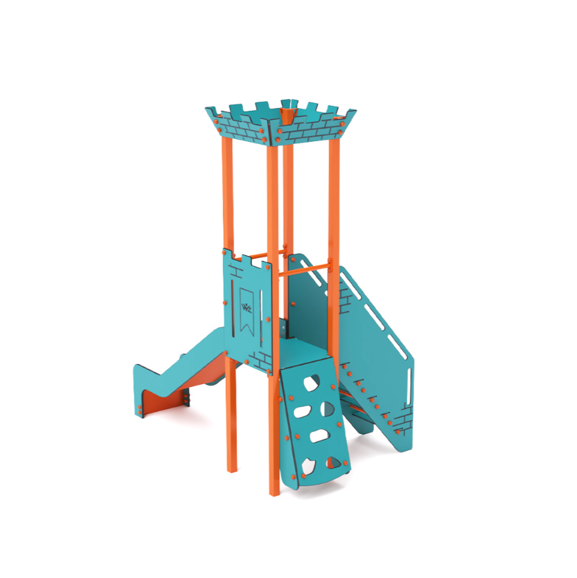 Věž s cimbuřím, na kterou děti vylezou po šikmé lezecké stěně nebo schodišťovém výstupu, a dolů se mohou sklouznout po skluzavce. Tyrkysovo-oranžový design láká ke hře už z dálky. Ocelová konstrukce je odolná vůči povětrnostním vlivům díky žárovému zinkování a lakování odolnou práškovou barvou. Použitý HPL materiál je chemicky odolný, odolný vůči UV záření – stálobarevný, netoxický, recyklovatelný a nelámavý. Není tak riziko poranění dětí ostrými hranami nebo úlomky. Všechny spoje jsou nerezové a zakryté plastovými krytkami pro zvýšení životnosti a bezpečnosti.