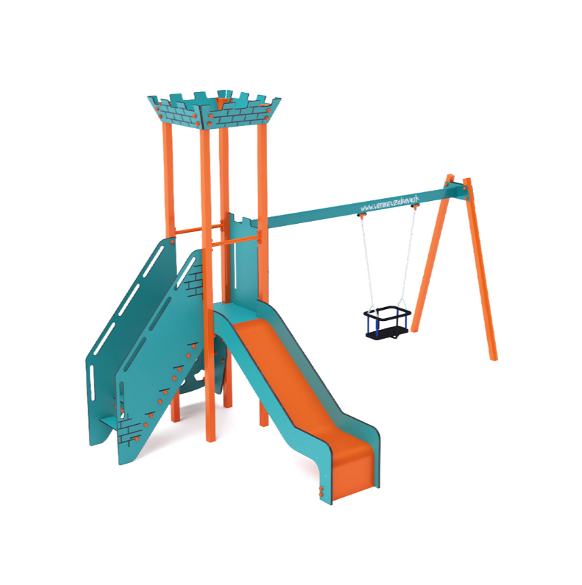 Věž s cimbuřím, na kterou děti vylezou po šikmé lezecké stěně nebo po schodišťovém výstupu, a dolů se mohou sklouznout po skluzavce. Věž je doplněna o visutou houpačku. Tyrkysovo-oranžový design láká ke hře už z dálky. Ocelová konstrukce je odolná vůči povětrnostním vlivům díky žárovému zinkování a lakování odolnou práškovou barvou. Použitý HPL materiál je chemicky odolný, odolný vůči UV záření – stálobarevný, netoxický, recyklovatelný a nelámavý. Není tak riziko poranění dětí ostrými hranami nebo úlomky. Všechny spoje jsou z nerezové oceli a zakryté plastovými krytkami pro zvýšení životnosti a bezpečnosti.