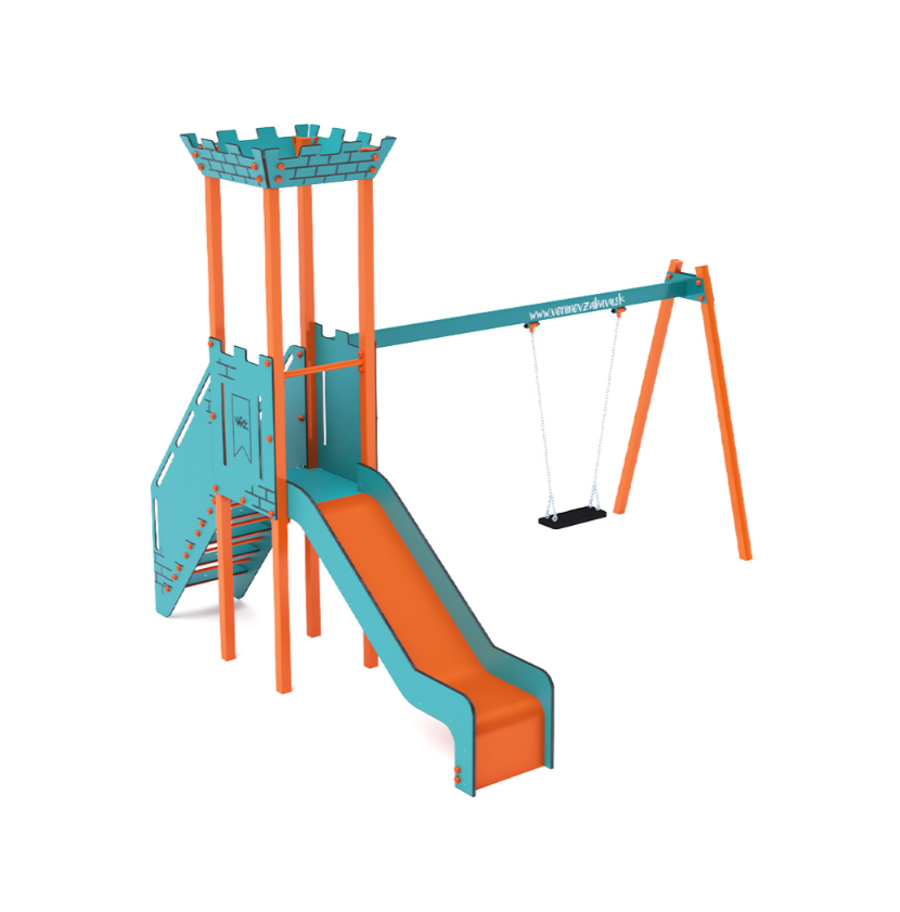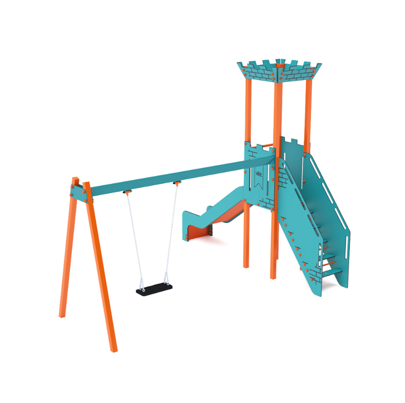 Věž s cimbuřím, na kterou děti vylezou po schodišťovém výlezu a dolů se mohou sklouznout po skluzavce. Tyrkysovo-oranžový design láká ke hře už z dálky. Ocelová konstrukce je odolná vůči povětrnostním vlivům díky žárovému zinkování a lakování odolnou práškovou barvou. Použitý HPL materiál je chemicky odolný, odolný vůči UV záření – stálobarevný, netoxický, recyklovatelný a nelámavý. Nevzniká tak riziko poranění dětí ostrými hranami nebo úlomky. Všechny spoje jsou nerezové a zakryté plastovými krytkami pro zvýšení životnosti a bezpečnosti.