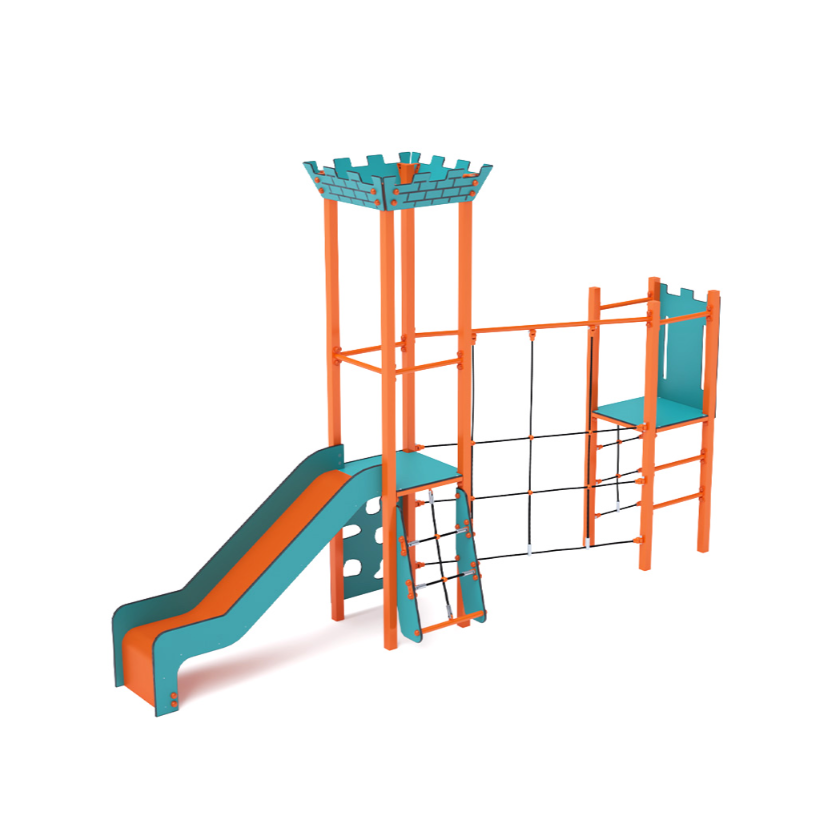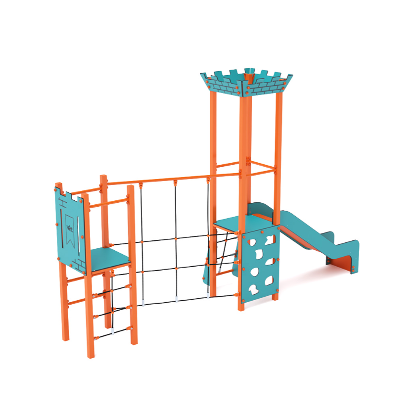 Věže jsou propojeny diagonálním lanovým mostem. Na sestavu děti vylezou po kolmém lanovém výstupu, kolmém žebřinovém výstupu, kolmém lezeckém výstupu, šikmém lanovém výstupu a schodišťovém výstupu. Dolů se mohou sklouznout po skluzavce. Tyrkysovo-oranžový design láká ke hře už z dálky. Ocelová konstrukce je odolná vůči povětrnostním vlivům díky žárovému zinkování a lakování odolnou práškovou barvou. Použitý HPL materiál je chemicky odolný, odolný vůči UV záření – stálobarevný, netoxický, recyklovatelný a nelámavý. Nevzniká tak riziko poranění dětí ostrými hranami nebo úlomky. Všechny spoje jsou z nerezové oceli a zakryté plastovými krytkami pro zvýšení životnosti a bezpečnosti.