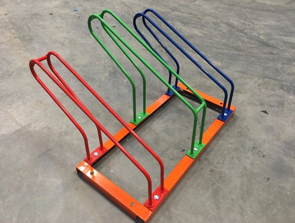 Dětský kovový stojan na 3 jízdní kola s práškově lakovanou konstrukcí.