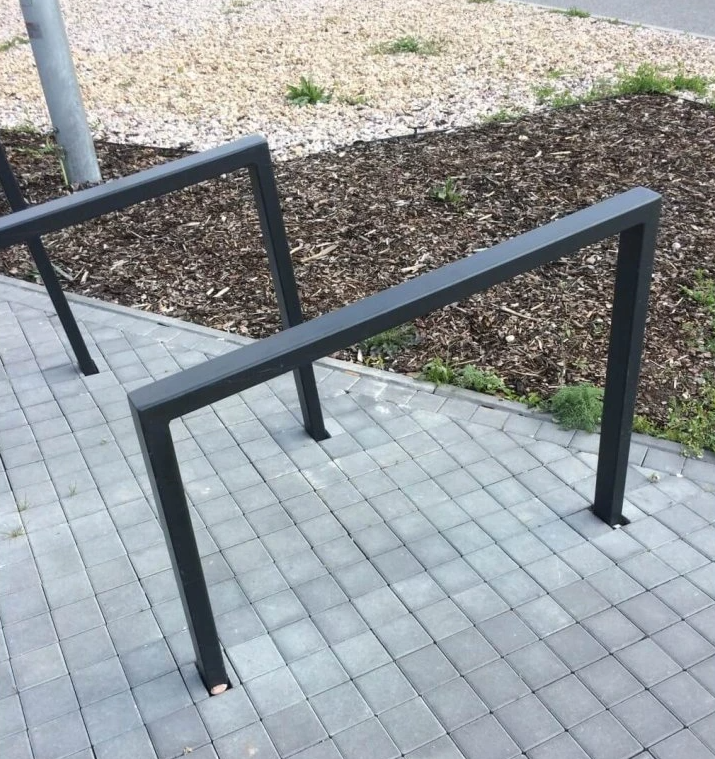 Moderní kovový stojan na jízdní kola ve tvaru obráceného písmene U s žárově pozinkovanou konstrukcí nebo vypalovaným lakem.