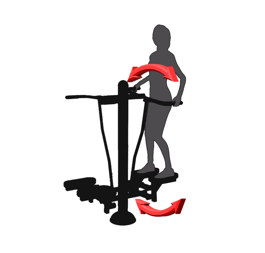 Jak cvičit – pevně uchopte držadla a postavte se na pedály. Jednu nohu zatlačte dolů do napnuté polohy, druhou zvedněte tak, aby bylo koleno pokrčené, a rukama pohybujte držadly nahoru a dolů. Pohyby provádějte pomalu a kontrolovaně. Počet opakování zvyšujte postupně podle zlepšení kondice.